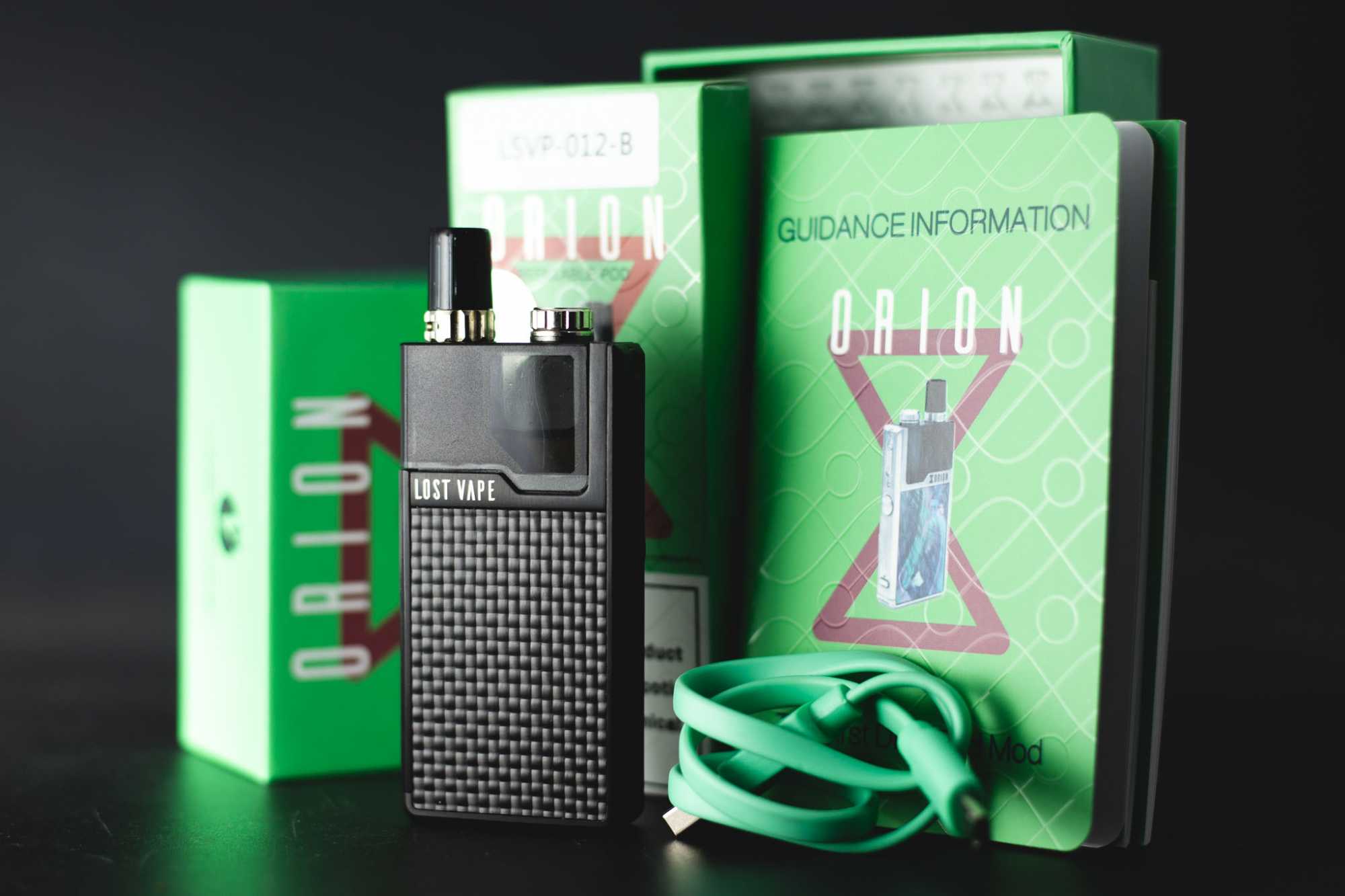 Внутри, помимо мода, лежат USB-кабель, подвеска для девайса, различная обучающе-гарантийная макулатура и комплект из двух сменных картриджей на 0,25 Ом. Сам Lost Vape Orion DNA Go хранится в подставке из плотного пластика. В девайс вставлен картридж на 0,5 Ом.