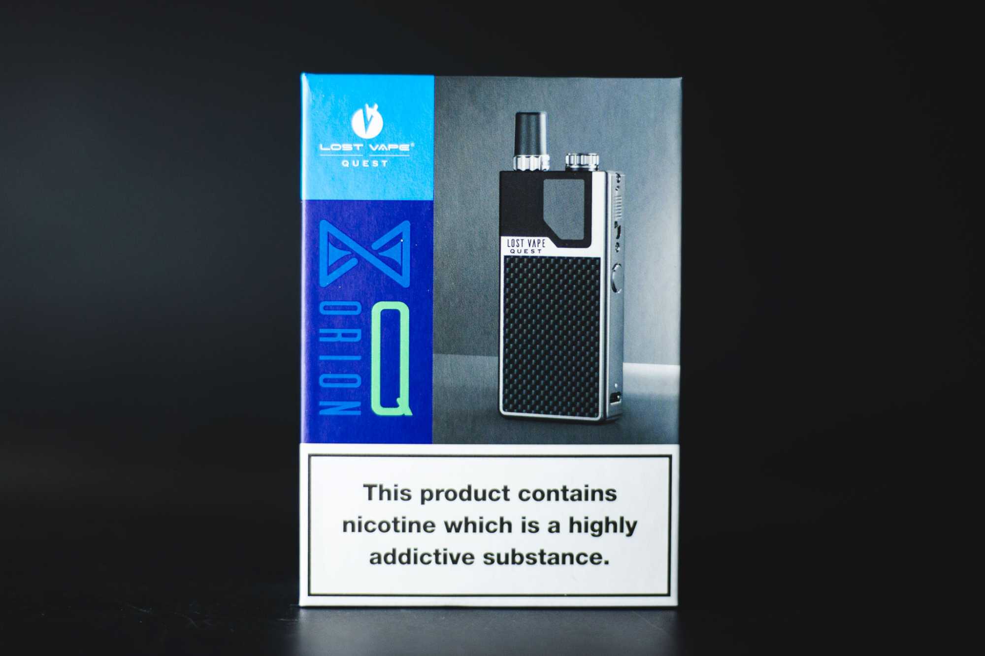 Lost Vape Orion Q обильно украшен. Отстегивающая картридж кнопка фрезерована насечками. По бокам красуются 2 белых логотипа — «Lost Vape» с «A» без черточки и «Orion ⏳ Q» с иконкой песочных часов. По бокам есть вставки под карбон. На картридже тоже всюду насечки.