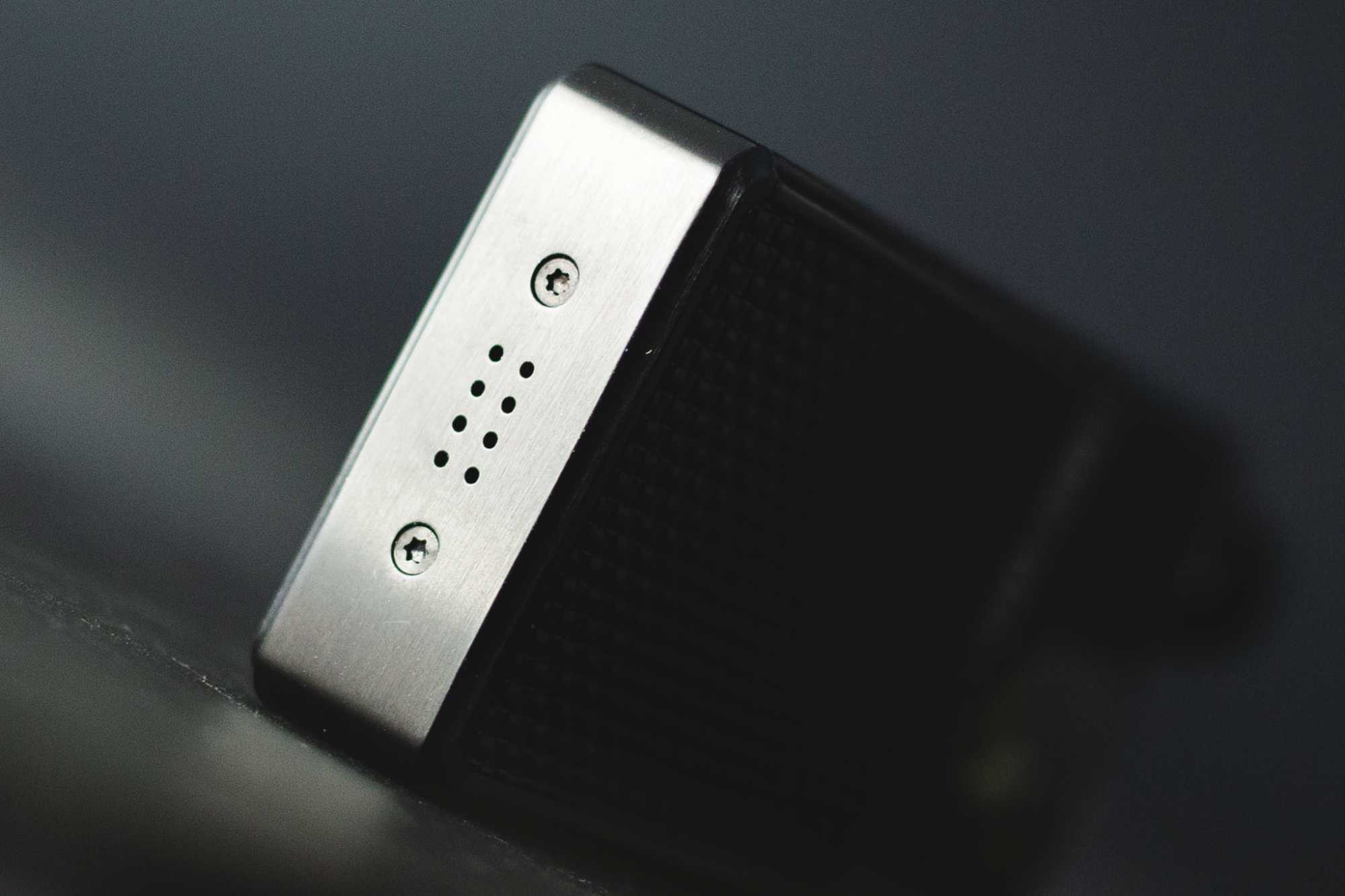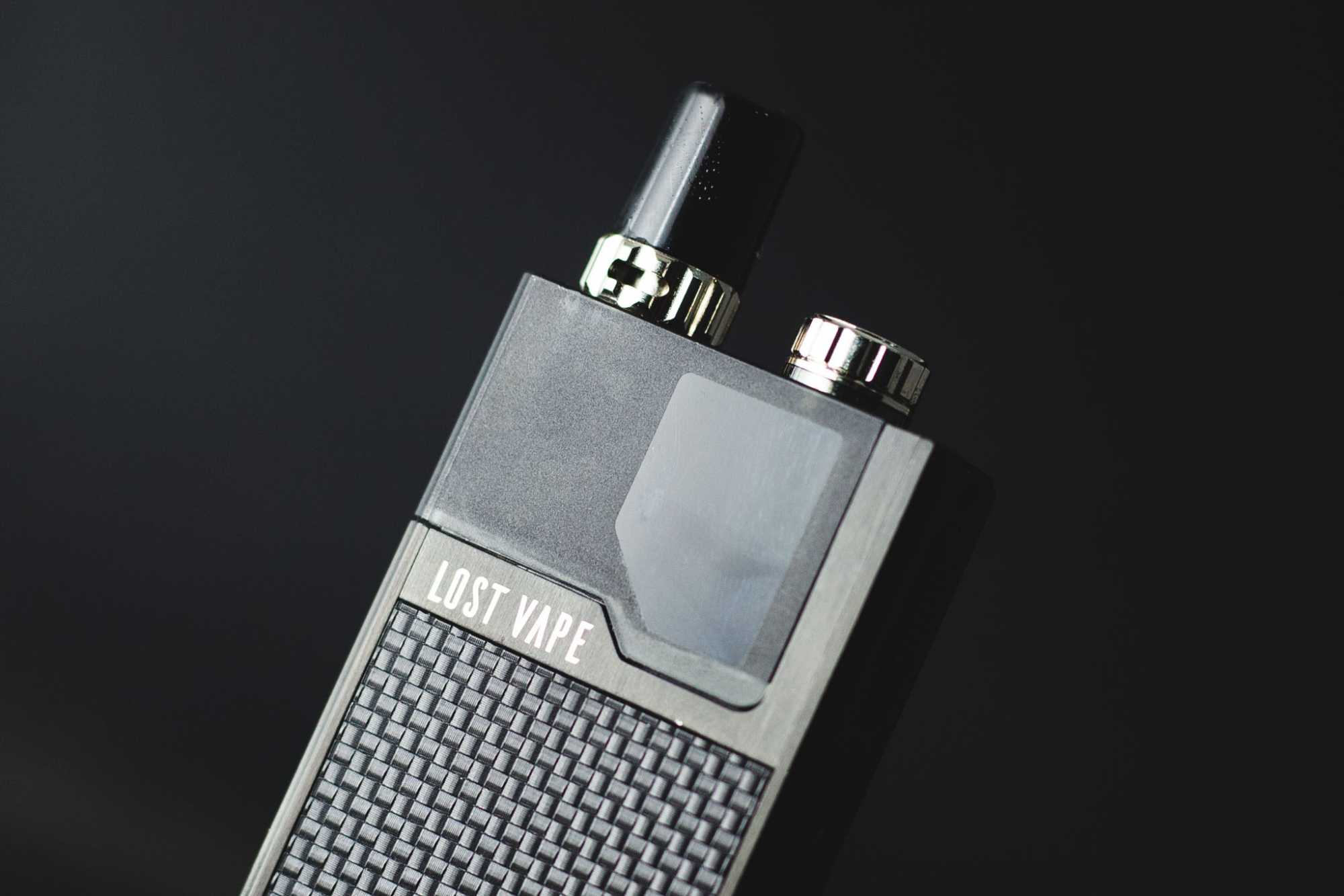 Каркас Lost Vape Orion Q сделан из приятного тяжеленького пластика, оформленного под металл; он бывает в 4 цветах — черном, стальном, синем и золотом. Покупать нужно, несомненно, черный: во-первых, это главный цвет, во-вторых, он меньше контрастирует со вставкой под карбон.