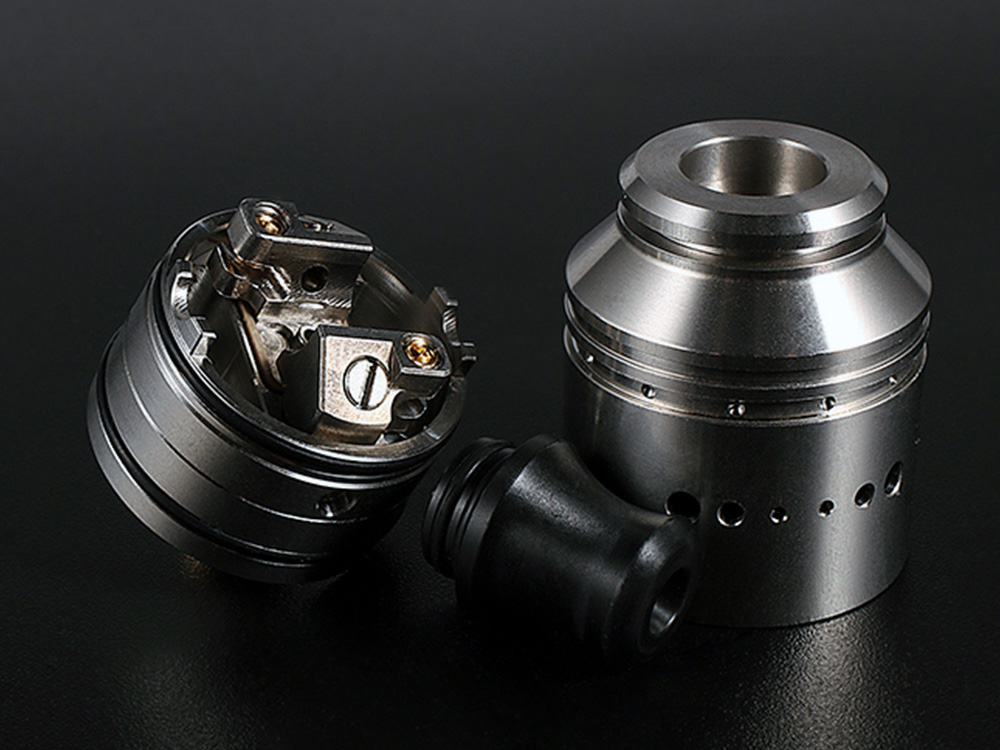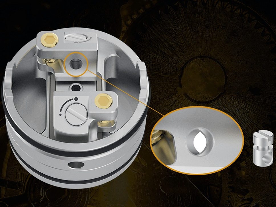Спираль горизонтально располагается между двух стоек и прижимается сверху позолоченными винтами с шестигранными шляпками, на бортах имеются пазы для выравнивания. Воздух проходит по герметичным каналам в стенках базы и поступает на намотку с боков и снизу. Периферийные потоки можно настроить при помощи жиклеров с прямыми шлицами. Ванночка вмещает 1 миллилитр жидкости. Стандартный пин можно заменить на BF.