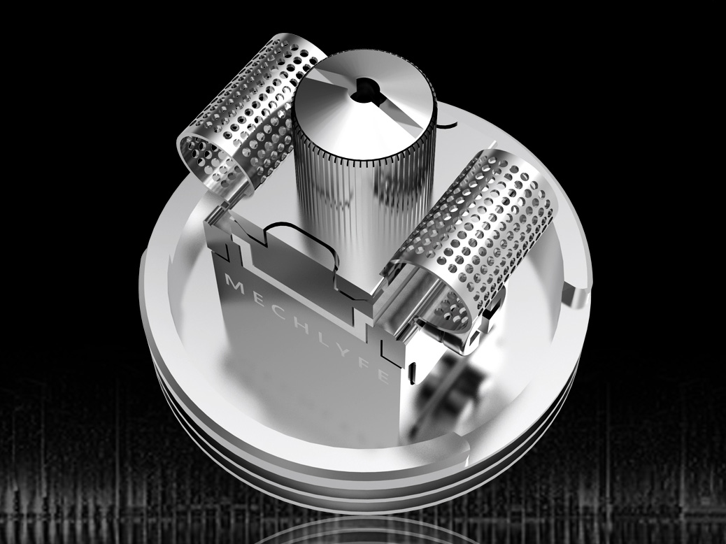 Под куполом скрывается прямоугольная конструкция с тремя прижимными пластинами для установки двух спиралей либо сеток. Ножки располагаются в горизонтальных и вертикальных плоскостях. За боковую фиксацию отвечают два крестовых винта, сверху намотку прижимает нестандартный экземпляр, закручивать который можно без помощи инструментов. При использовании сквонк-пина жидкость будет поступать на вату сверху вниз, через массивный центральный винт. Для вариативности обдува на внутренних стенках топкепа предусматриваются разнообразные вырезки.
