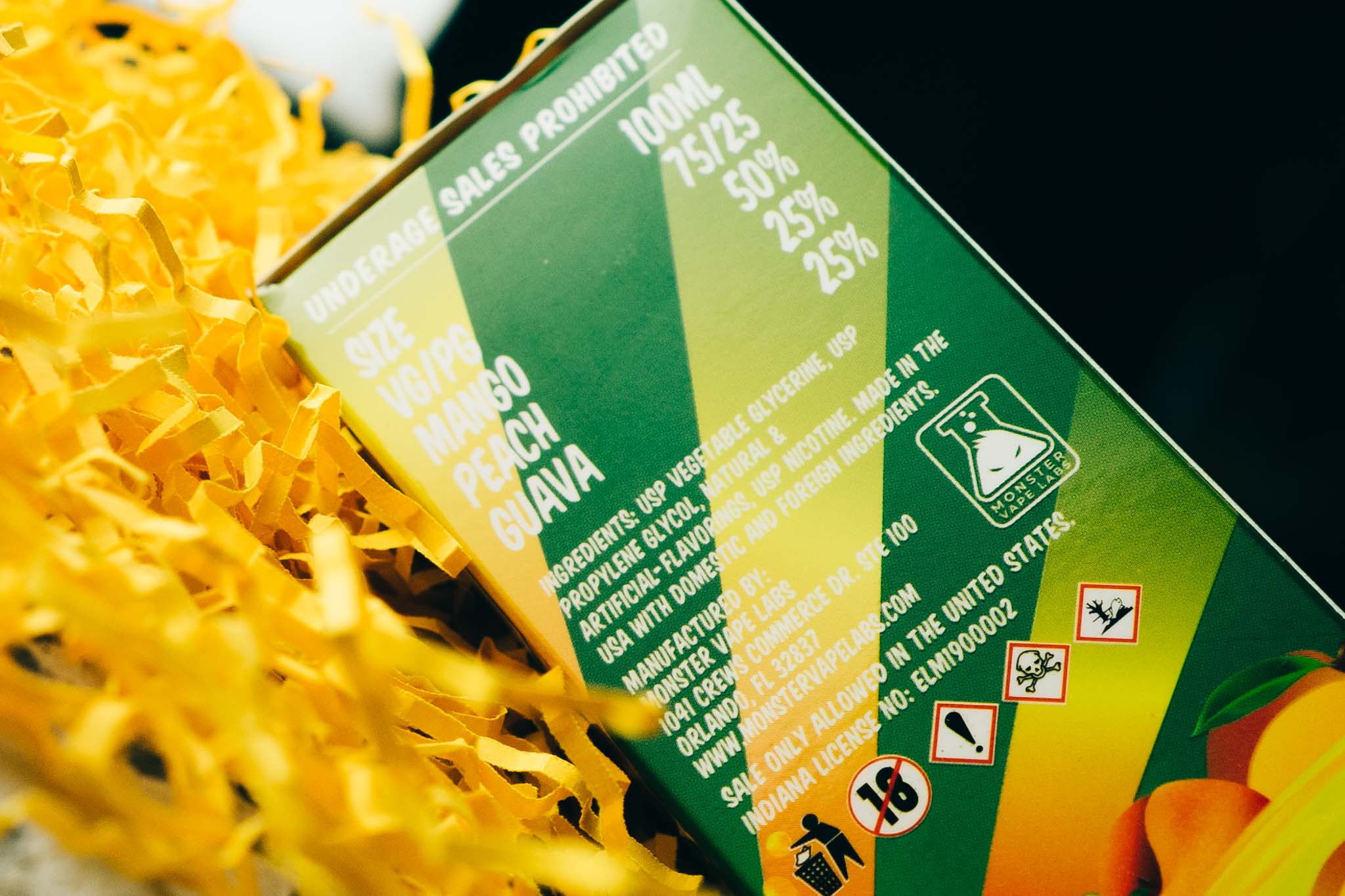 Жидкость поставляется в цветных коробках, цвет и оформление которых зависят от выбранного вкуса. На лицевой стороне написаны название, крупное предупреждение о наличии никотина, а также указания на объем и крепость. На правой грани располагаются блоки с составом, юридической информацией и маркировками. На противоположной стороне — перечень линеек производителя. На обороте пишутся стандартные для США предупреждения и ссылки на социальные сети производителя. Все коробки запечатываются при помощи специальных верификационных марок. На каждой из них — ссылка и код для проверки подлинности.