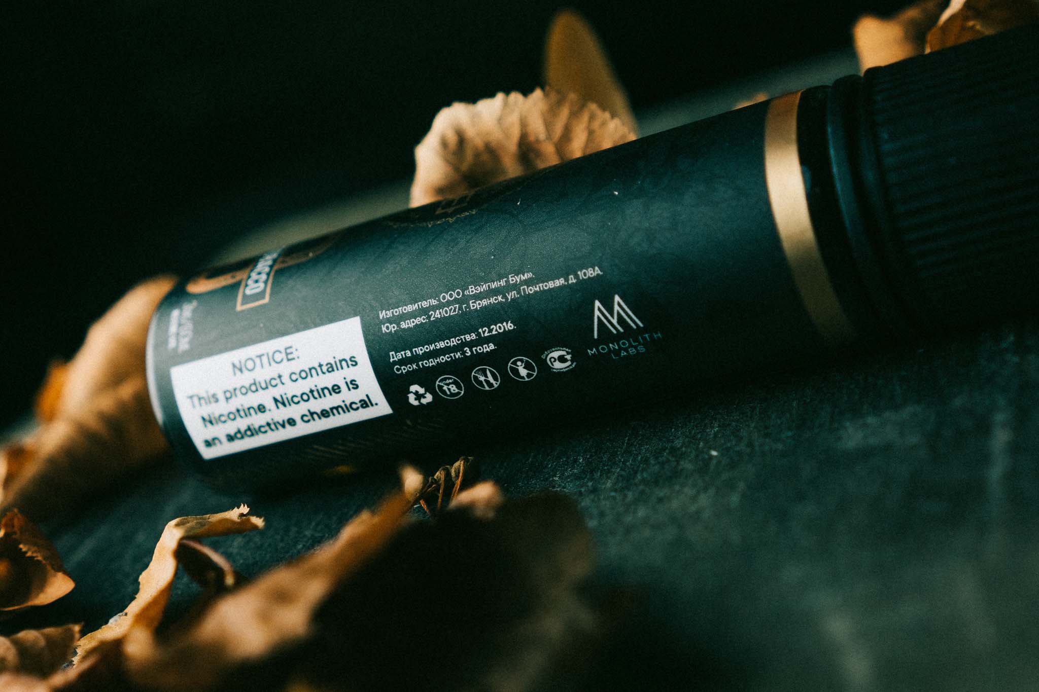 Жидкость приезжает в черных коробках с матовым покрытием. Некоторые элементы оформления выделяются глянцем. На лицевой стороне пишутся названия линейки и вкуса, а также указания на объем и крепость никотина. На одной из граней — крупное предупреждение на английском языке, сообщающее о наличии в жидкости никотина. Еще одна сторона отводится под логотип производителя, штрихкод, юридические данные и маркировки. На обороте располагаются предупреждения, краткое описание и указание на баланс.