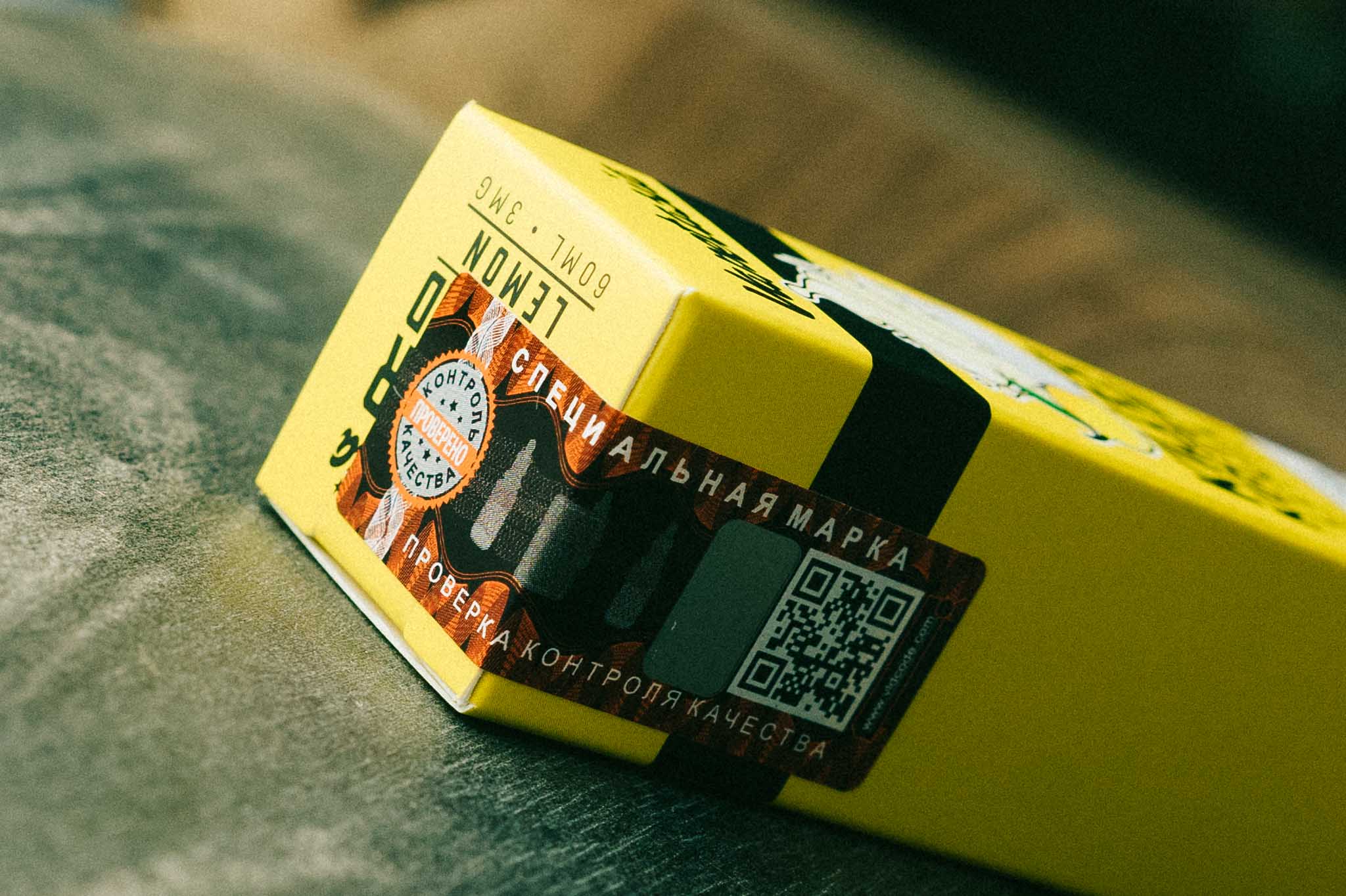 Killer Kustard поставляют в матовых коробках желтого цвета. На лицевой стороне кейсам можно увидеть небольшую миниатюру, которая явно указывает на содержимое флакона. Рядом пишут названия линейки и вкуса, а также наименование производителя. Чуть ниже — указания на крепость и объем. Еще ниже — крупное предупреждение, сообщающее о наличии в жидкости никотина. Вся прочая информация располагается на обороте коробки. Там находятся стандартные для США предупреждения, состав, юридические данные и ссылка на социальные сети производителя. Штрихкод — есть. Коробка запечатывается при помощи специальных контрольных марок. На них — QR-ссылка и код для верификации продукта.