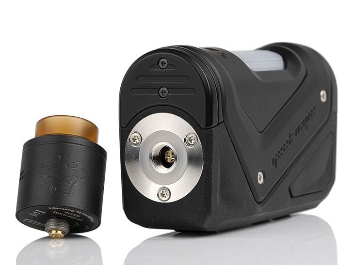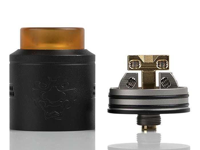 Мод комплектуется вышедшей ранее дрипкой — Tengu RDA. В центре базы располагаются три стойки, одна из которых выглядит как массивная позолоченная буква Т с распределителем жидкости на верхней площадке. Ножки двух спиралей фиксируются в горизонтальных плоскостях при помощи шестигранных винтов. Предусматривается пара разнообразных 810-х дриптипов, помимо того имеется адаптер под вариант с 510-й посадкой. Боковой обдув регулируется поворотом топкепа. Сквонк пин можно заменить на обычный.