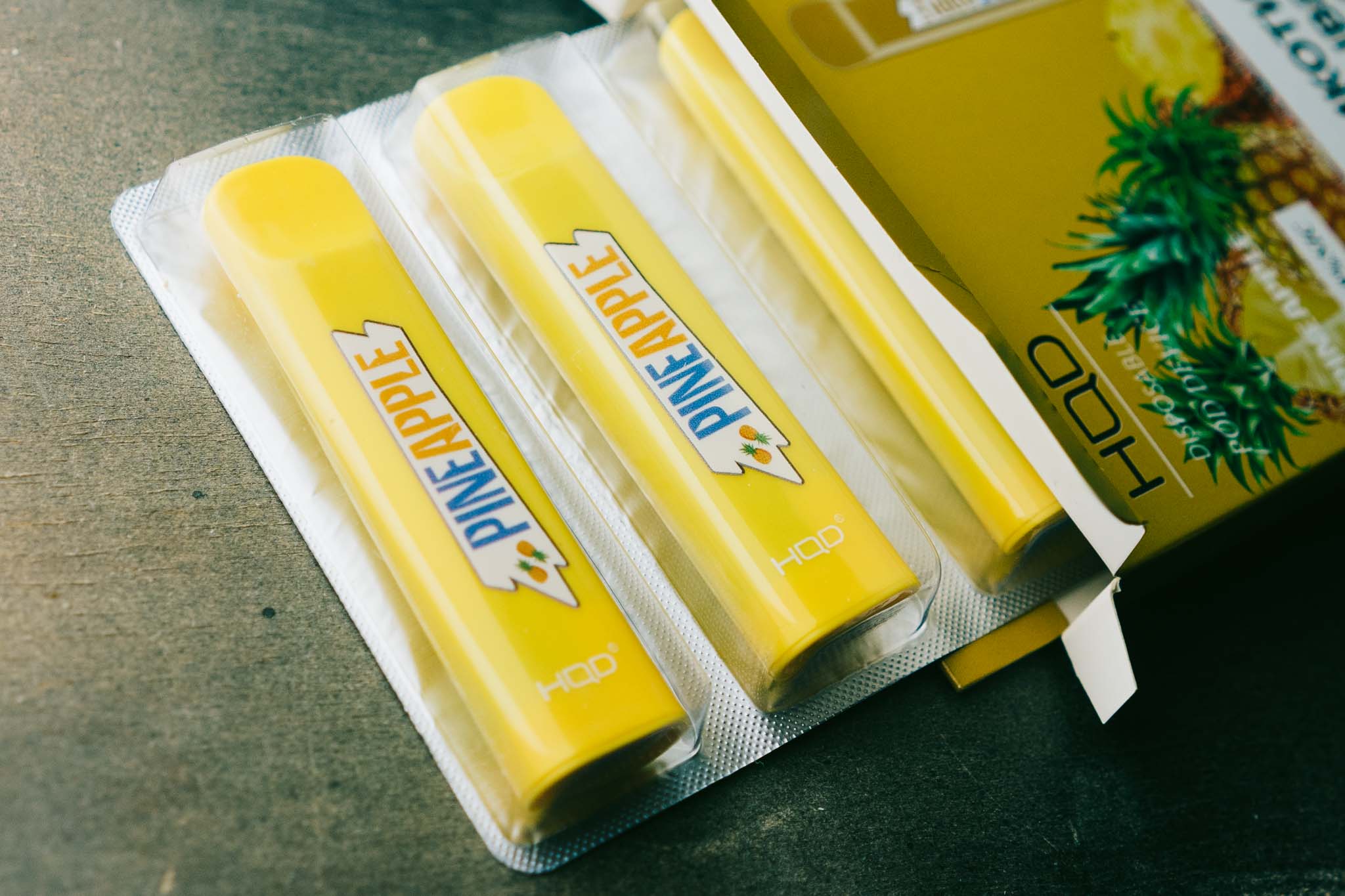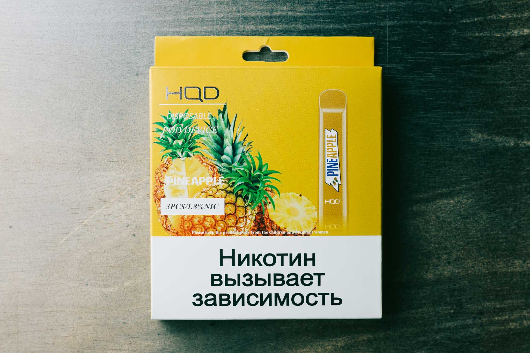 HQD CUVIE приезжает в картонных коробках с матовым покрытием. Цвет оформления зависит от выбранного микса и намекает на его направленность. На лицевой стороне изображаются задействованные ингредиенты, а также сам девайс. Рядом пишут указания на крепость никотина, а также названия. Ниже — крупное предупреждение. На боковых гранях — маркировки и пометки «18+». На обратной стороне располагаются меры предосторожности, характеристики устройств, юридические данные и штрихкод. Там же — наклейка для проверки оригинальности устройства.
