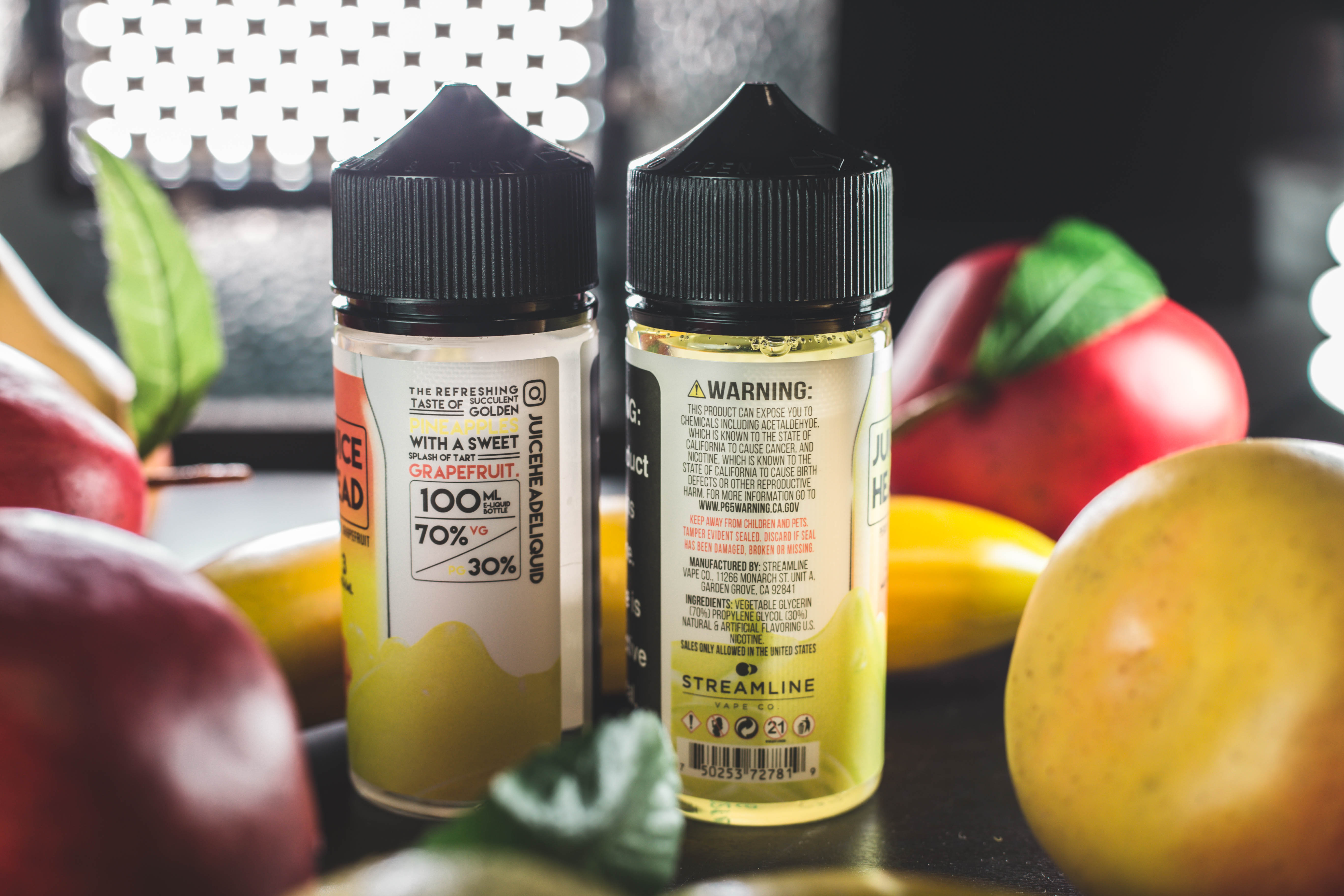 Juice Head поставляется в картонных коробках с глянцевым покрытием. Цветовая гамма и зависит от выбранного вкуса. На лицевой стороне пишутся названия, указания на крепость с объемом и стандартное для США предупреждение. Слева — ник производителя в социальных сетях, описание вкуса и указание на баланс. На противоположной грани пишут аналогичную информацию. Позади можно найти состав, юридические данные и маркировки. Там же дублируются предупреждения и изображаются маркировки.