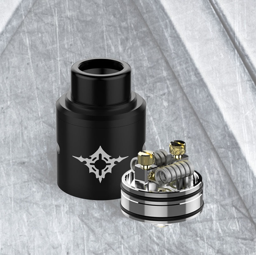 В качестве напарника выступает алюминиевая дрипка Metis RDA с весьма простой и понятной конструкцией. На ровную цилиндрическую юбку усаживается вращающаяся крышка с 810-м дриптипом из дельрина. Внутри находятся две прямоугольные стойки с просторными слотами и крупными винтами под прямую отвёртку для горизонтальной фиксации двух спиралей.