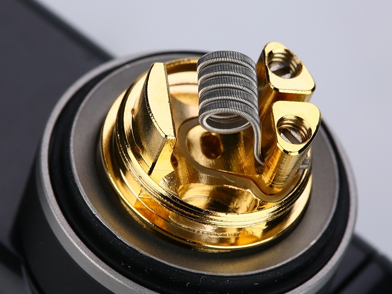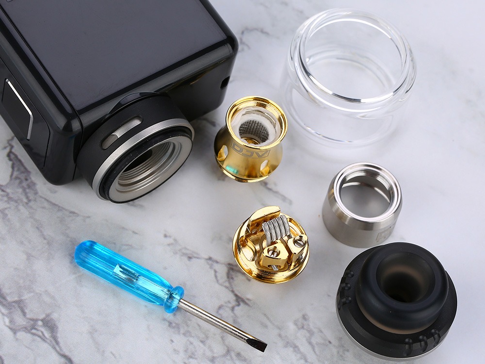 Одноимённый комплектный бак может работать как со сменным «сеточным» испарителем на 0,3 Ом, так и с полноценной обслуживаемой базой под одну спираль. На небольшой съёмной деке располагаются две стойки со сквозными слотами для горизонтальной фиксации ножек, а также изогнутая перфорированная стенка, отвечающая за обдув намотки. Объём резервуара можно увеличить с 2,5 до 4,5 мл. Обдув настраивается нижним кольцом. Заправочные отверстия находятся сверху.