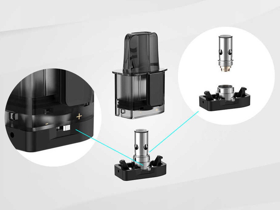 Активировать девайс можно как кнопкой, так и затяжкой. Для работы доступно два уровня мощности — 8 и 9 ватт, переключение осуществляется зажатием кнопки fire. Питание обеспечивает небольшой встроенный аккумулятор с запасом в 800 мАч. Сопротивление намотки может варьироваться от 0,3 до 5,0 Ом. На съёмной базе магнитного картриджа имеется ползунок для настройки обдува. Объём бака составляет 2 мл, заправочное отверстие находится сбоку, под силиконовой заглушкой. Стандартным комплектом предусматривается пара испарителей на 1,3 Ом и оригинальный ремешок, выполняющий функцию зарядного кабеля.