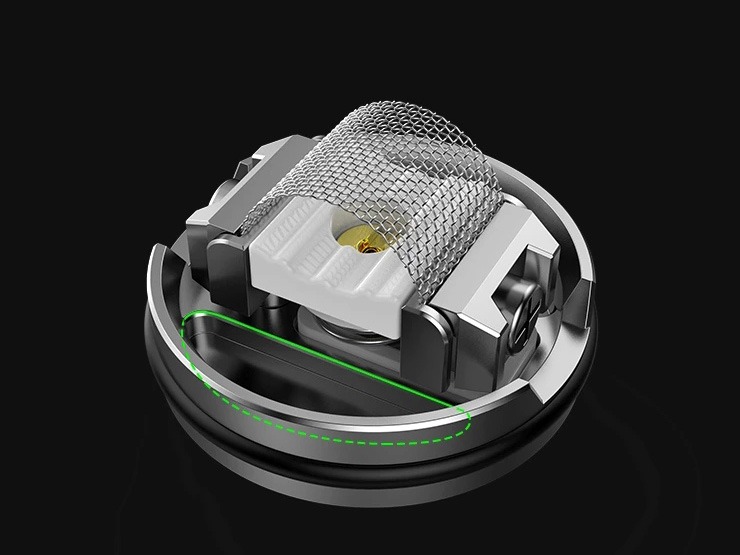 По бокам базы находятся две широкие пластины с крестовыми винтами, они отвечают за вертикальную фиксацию ножек намотки. Её роль может выполнять как сетка, так и спираль. Стандартным комплектом предусматривается сразу три варианта сеток с разнообразными формациями. В центре располагается ребристая подпружиненная площадка из керамики, прижимающая хлопок и обеспечивающая равномерную подачу жидкости. Периферию занимает пара вместительных ванночек. Обдув можно реализовать как в свободном, так и в «сигаретном» стиле. Имеется пин для сквонка.