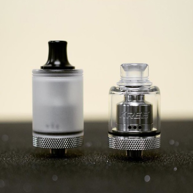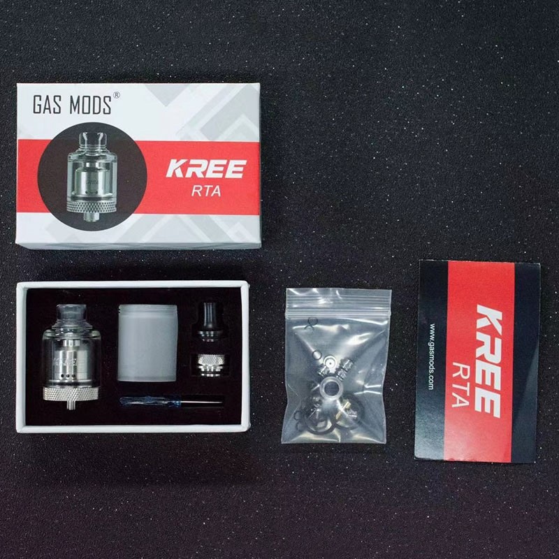 Компания Gas Mods выпустила Kree RTA. Это небольшой обслуживаемый бак с комплектом сменных вставок для регулировки тугой затяжки, дополнительной небьющейся колбой и декой под одну спираль.