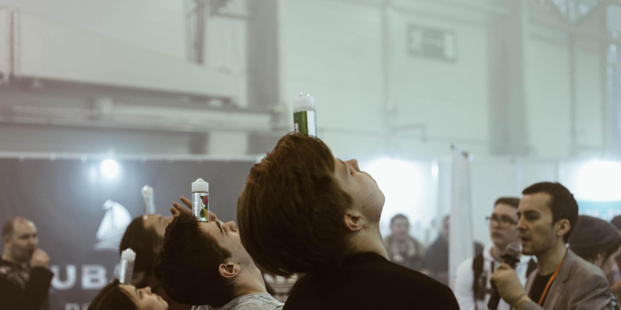 Развлечения на стенде начали в час — и сразу же отправили вейперов заниматься спортом. Цель — поставить флакон на лоб и сделать как можно больше приседаний, не уронив заветный джус на пол. Конкурс постепенно из развлечения превратился в полноценный спорт: один из раундов основательно затянулся, когда вейп-олимпийцы никак не могли потерять баланс.