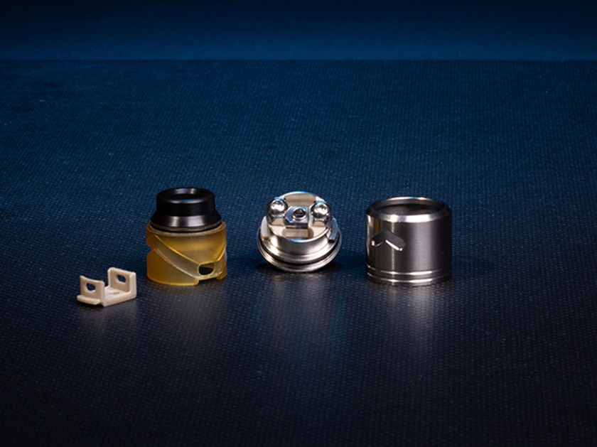 За двухслойным корпусом скрывается разборная вариативная база под одну спираль. Ножки фиксируются в горизонтальной плоскости при помощи шестигранных винтов. Сменная позитивная стойка реализуется в двух версиях — под свободную и тугую затяжку. Кроме того, предусматриваются четыре пина для разных видов обдува и подачи жидкости. По периферии массивного изолятора располагаются две вместительные ванночки. Воздушный поток поступает на намотку снизу, предварительно пройдя путь по герметичным каналам между двумя куполами.