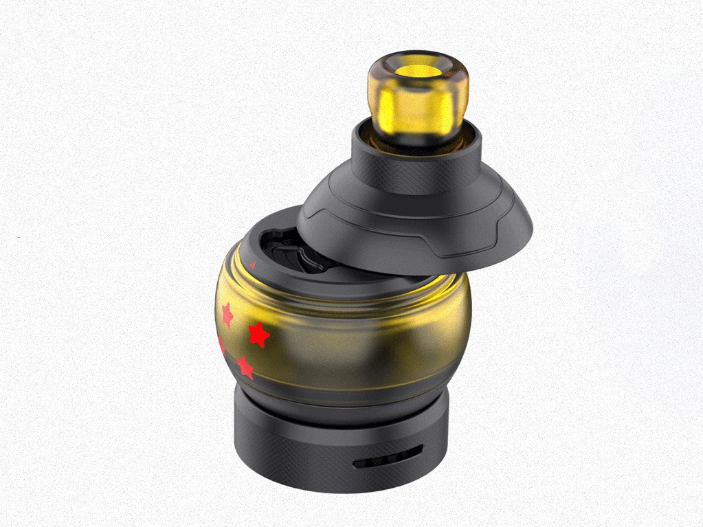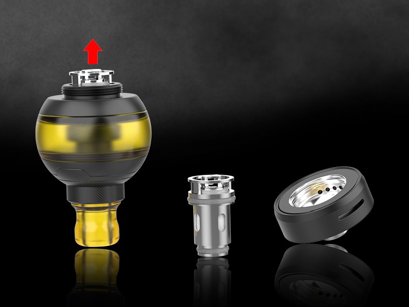 Внутри скрывается привычная необслуживаемая база с предустановленным испарителем на 0,7 Ом. Помимо резервного варианта с сопротивлением в 1,2 Ом, можно устанавливать экземпляры из довольно распространённой линейки GT от небезызвестной компании Eleaf. Для замены испарителя не нужно сливать жидкость из бака. Обдув может быть реализован как в свободном, так и в «сигаретном» стиле. Для настройки необходимо повернуть нижнее кольцо. Шарообразная колба имеет слегка увеличенный объём в 2,7 мл. И без того небьющийся резервуар можно дополнительно защитить широким вейп бендом.