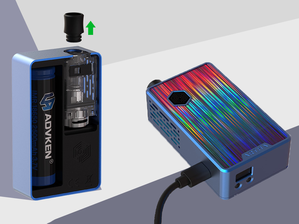 6 марта компания Advken представила в инстаграме стартовый набор — Artha Pod Mod. Универсальный all-in-one девайс реализовали в виде минималистичного прямоугольного бруска из анодированного алюминия. Корпус эргономично округлили в углах и раскрасили в пяти вариациях. На широких торцах разместили съёмные магнитные панели с разнообразными текстурами и паттернами. Верхнюю площадку укомплектовали приталенным 510-м дриптипом. Фасад перфорировали крупной воздухозаборной решёткой, ниже разместили USB-порт. Маленький дисплей и пару регулировочных клавиш отправили на дно. Шестигранная кнопка активации нашла своё место на одной из боковин.