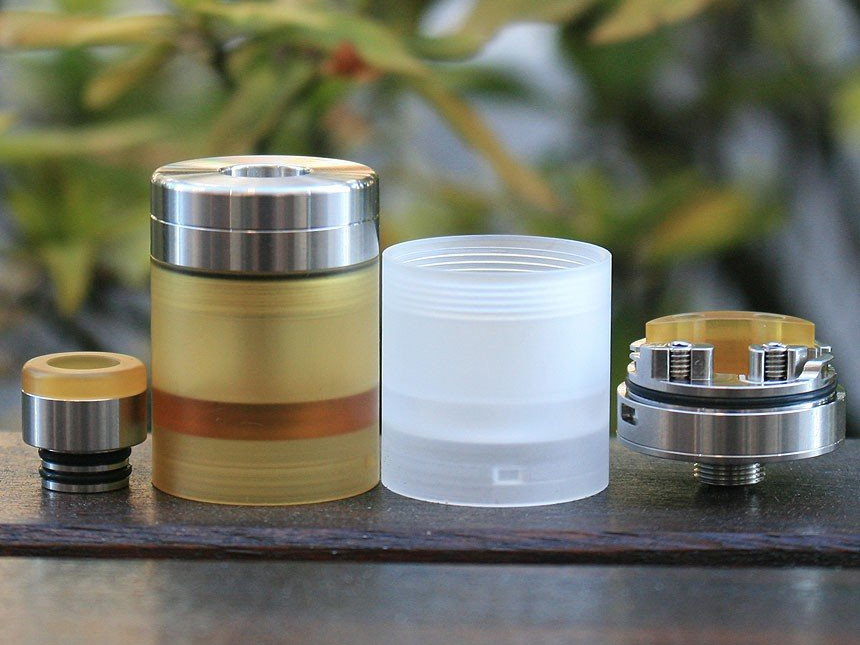 Под самый конец 2019 года ассортимент интернет-магазинов пополнился оригинальным обслуживаемым баком — Theatro RTA от хорватской компании Van & Del Design. Устройство исполнили из сочетания высококачественной нержавеющей стали и ultem-пластика в семи расцветках. Минимаилистичный строгий корпус гармонично дополнили прямой матовой колбой из небьющегося термостойкого полимера. Сверху примостили скручивающийся топкеп с комбинированным 510-м дриптипом, собранным из металлического основания и пластикового наконечника. Под резервуаром разместили вращающееся кольцо с разнообразными воздушными перфорациями.