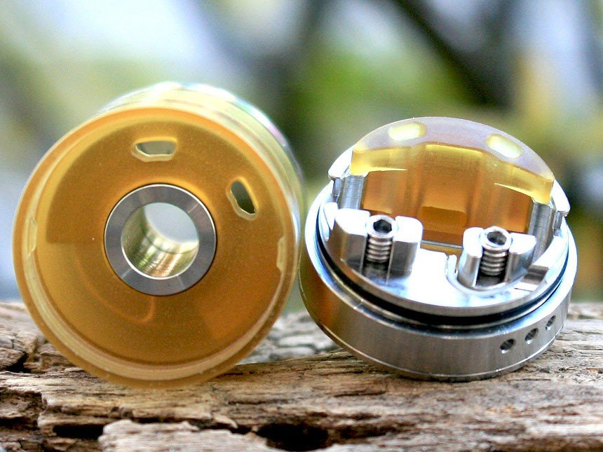 Внутри находятся две приземистые стойки с шестигранными винтами, а также крупная полукруглая вставка для уменьшения объёма воздушной камеры и улучшенной концентрации обдува. Затяжку можно установить как в свободном, так и в «сигаретном» стиле. Помимо того, предусматривается регулировка подачи жидкости, вплоть до полной изоляции резервуара, для настройки потока необходимо повернуть верхушку шахты. Ножки спирали следует расположить в горизонтальной плоскости и зафиксировать сверху винтами. Объём бака можно увеличить с 2,5 до 5 мл при помощи альтернативной высокой колбы.