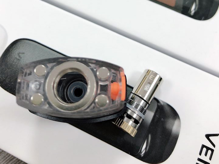 Выходная мощность может варьироваться в пределах от 10 до 20 ватт пропорционально сопротивлению испарителя, однако, ручной регулировке не поддаётся. В качестве элемента питания используется интегрированная батарея ёмкостью в 1200 мАч. Зарядку следует осуществлять через USB-порт формата Type-C током в 1,5А. Приплюснутый съёмный картридж обладает привычной конструкцией, включающей магнитный коннектор, бак на 2 мл и базу под один из двух быстросменных испарителей. Стандартным комплектом предусматривается два экземпляра под разные стили парения. Вариант на сетке располагает сопротивлением в 1,2 Ом, «сеточный» поддерживает 0,6 Ом. Настроить затяжку можно при помощи кольца на дне резервуара. Заправка осуществляется сбоку.
