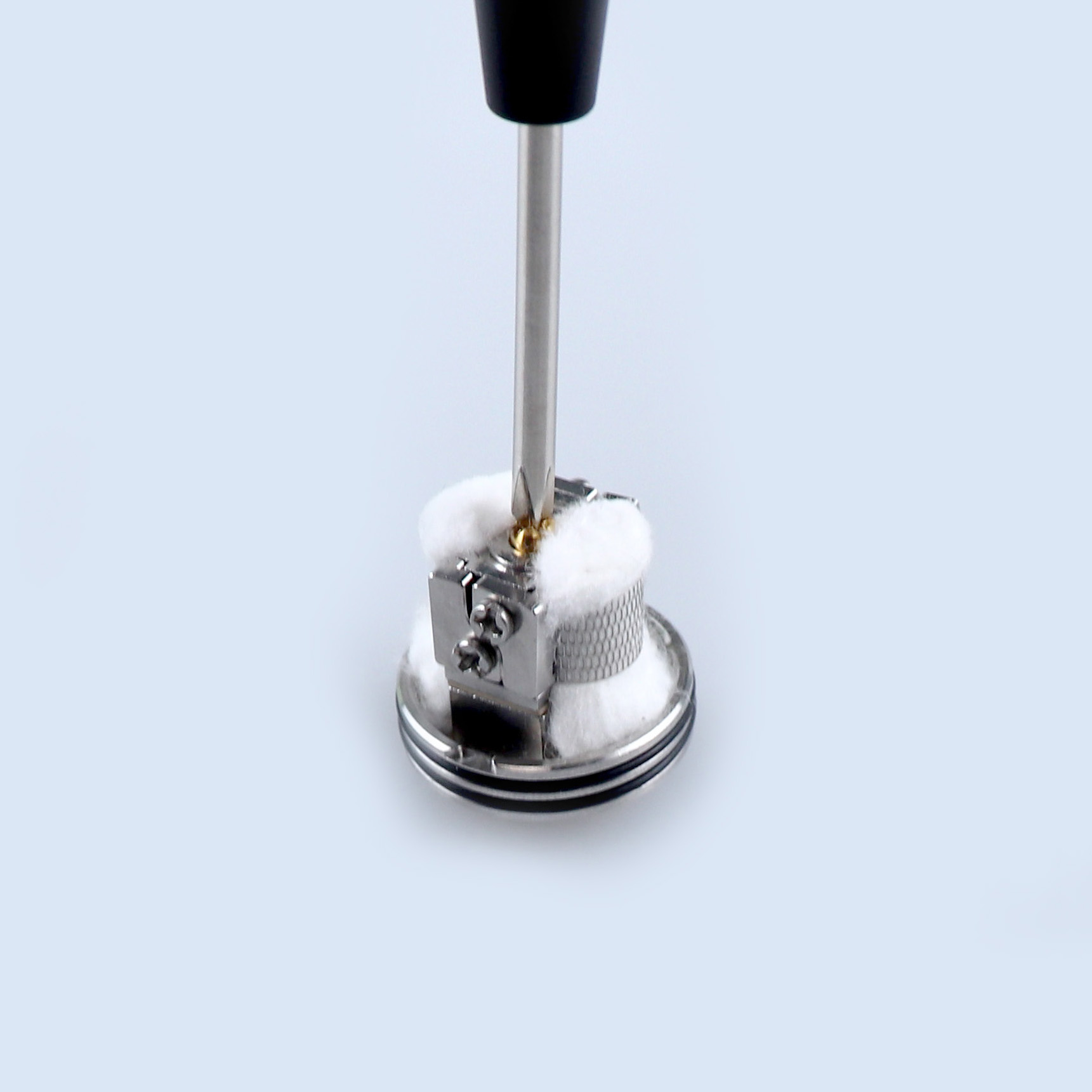 Под куполом скрывается массивная конструкция, предназначенная для фиксации двух сеток. Намотку следует расположить в вертикальной плоскости между широкими пластинами и зажать при помощи четырёх боковых винтов под крестовую отвёртку. Интенсивность бокового обдува можно детально настроить повернув крышку относительно базы. Предусматривается нижняя подача жидкости. Для работы со сквонкером достаточно выкрутить позолоченный винта на верхней площадке.