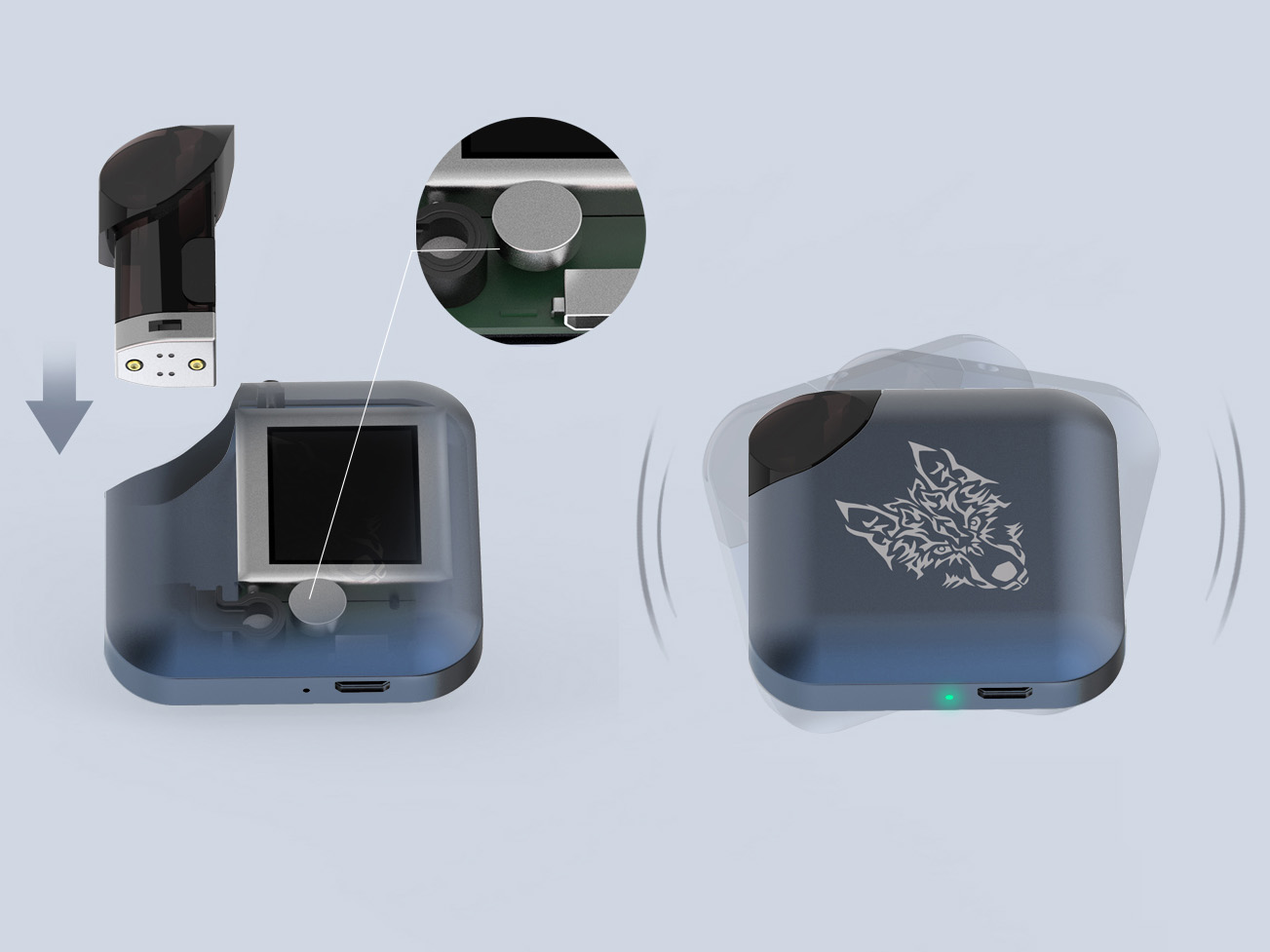 За алюминиевыми стенками трудится нерегулируемая плата, поддерживающая воздушную активацию, максимальную мощность в 11 ватт и полный комплект необходимых мер безопасности. За питание компактного девайса отвечает весьма вместительный аккумулятор ёмкостью в 700 мАч. Полный цикл зарядки током в 1А осуществляется за 50 минут. Магнитный картридж предусматривает «сигаретный» стиль парения. Внутри резервуара находится встроенный испаритель, снаряжённый усовершенствованной хлопковой набивкой для большего срока службы. Бак заправляется через боковую стенку и может уместить не более 1,5 мл жидкости. Фиксация сменного картриджа отображается вибрацией.