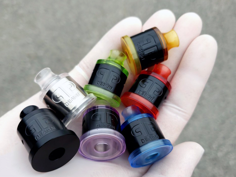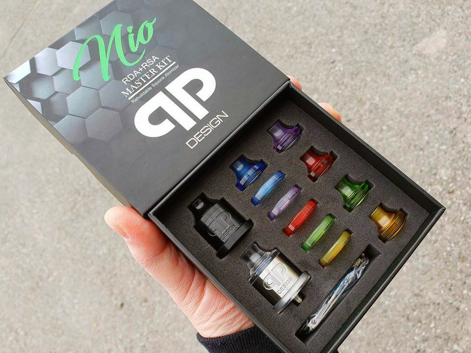 2 апреля канадская компания QP Design анонсировала на странице в фейсбуке новое устройство — Nio RDA/RSA. Вопрос расцветок решили весьма оригинальным образом — все возможные цветовые комбинации дрипки воплотили в одном наборе. Полированную стальную юбку дополнили идентичной чёрной альтернативой. Крышку и приталенный 510 дриптип реализовали из термостойкого пластика сразу в семи разноцветных вариантах. Для основания предусмотрели аналогичный «гардероб» из сменных посадочных колец, позволяющих увеличить диаметр с 22 до 24 мм. На боках вырезали пару горизонтальных перфораций и выбили крупный логотип.