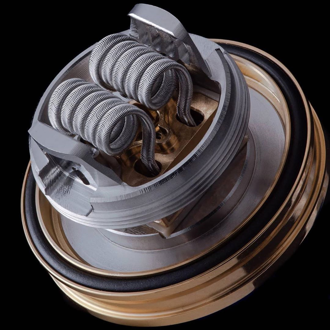 По бокам бесстоечной базы возвышаются две изрешечённые стенки. Между ними находится позолоченная платформа с четырьмя слотами для фиксации двух спиралей. Ножки следует установить в вертикальной плоскости, после чего зафиксировать боковыми шестигранными винтами в основании базы. Объёмный обдув намотки создаётся посредством десяти периферийных отверстий под разными углами, а также при помощи широкой крестообразной перфорации в центре деки. Настройка затяжки осуществляется нетривиальным регулировочным кольцом, передвигающимся вверх-вниз по резьбе. Имеется пара просторных сквозных ванночек для укладки хлопка.