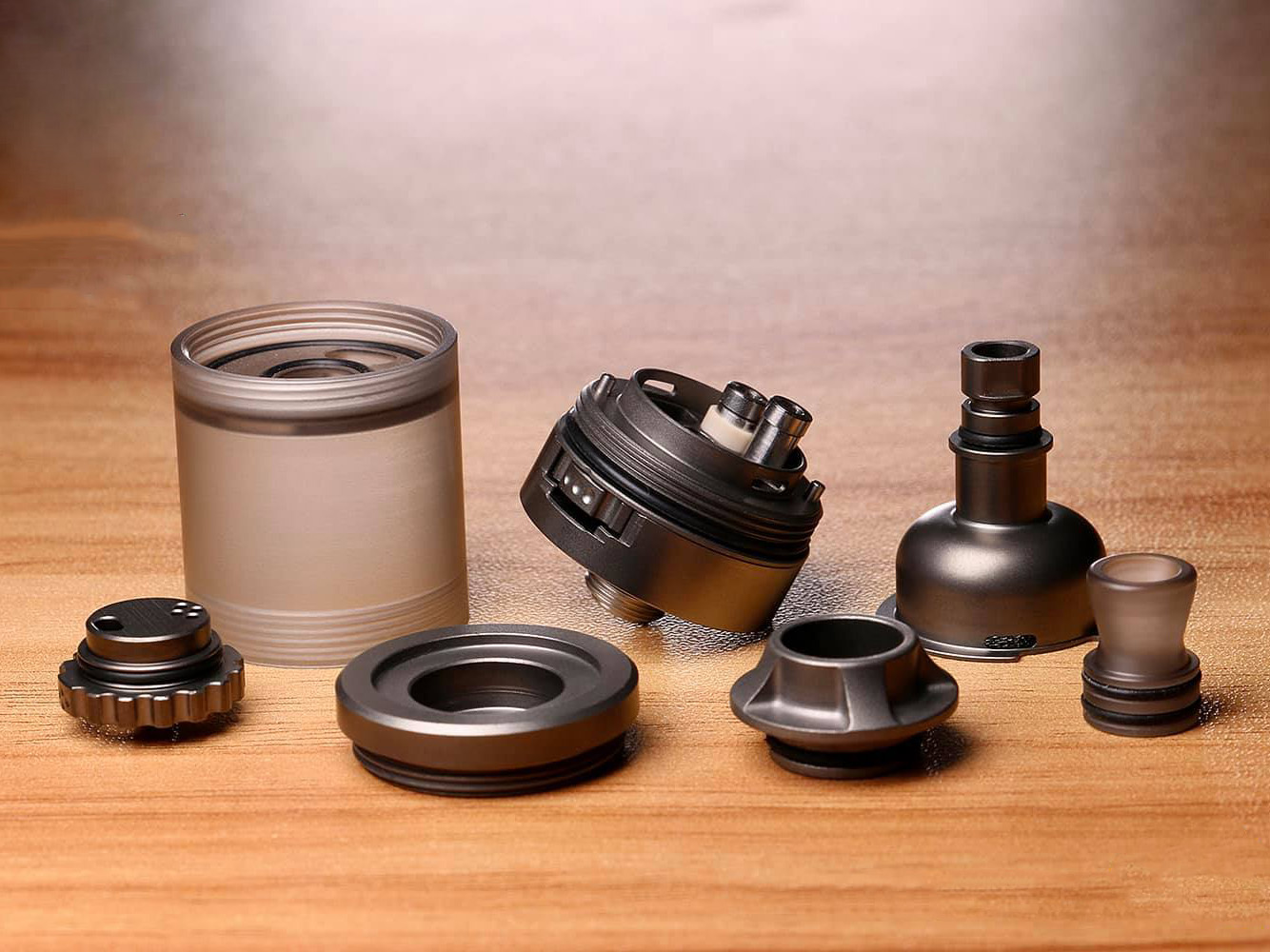 Главной особенностью необычного бака является система обдува. Прежде чем попасть на намотку, воздушный поток проходит через вращающийся ребристый барабан под декой. Оригинальные воздушные вставки предусматриваются в двух вариантах с разными формациями отверстий для возможности установки как свободного, так и тугого обдува. Кроме того, можно настроить интенсивность подачи жидкости в испарительную камеру. Для этого необходимо повернуть пьедестал дриптипа. На небольшой базе располагается пара цилиндрических стоек для горизонтальной фиксации одной спирали посредством шестигранных винтов. По бокам находятся ванночки для укладки ваты. Объём небьющейся колбы составляет 3,5 мл. Заправочные отверстия скрываются под топкепом.