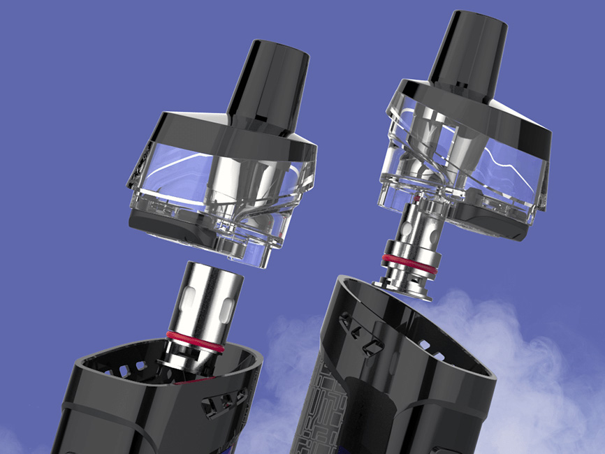 Девайс управляется фирменной платой AXON chip, работающей в пределах от 5 до 80 ватт при весьма быстром отклике в 0,001 с. Кроме привычного вариватта, предусматривается специальный режим — Pulse, осуществляющий предварительный нагрев намотки каждые 0,02 секунды. Работа обеспечивается за счёт внешней батареи формата 18650. USB-порт позволяет произвести довольно быструю зарядку током в 2А. Вместительный съёмный картридж реализуется сразу в двух экземплярах вместе с парой «сеточных» испарителей на 0,6 и 0,2 Ом из новой серии GTX. Помимо того, устройство можно снарядить вариантами из предыдущих линеек, а также полноценной обслуживаемой базой под одну спираль. Объём бака составит 2 либо 4 мл в зависимости от версии набора. Отверстие заправки находится на дне резервуара.
