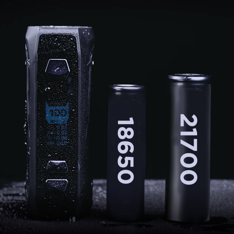 Внутри защищённого корпуса скрывается обновлённая плата AS-100 с максимальной мощностью в 100 ватт, температурным контролем и режимом bypass. Доступное сопротивление находится в диапазоне от 0,05 до 3,0 Ом. Отклик на кнопку зажигания занимает менее 0,02 секунды.Работа осуществляется за счёт ёмкого внешнего аккумулятора 21700. Кроме того, при помощи адаптера можно использовать батареи формата 18650.