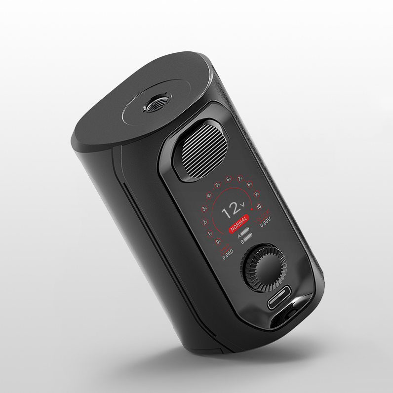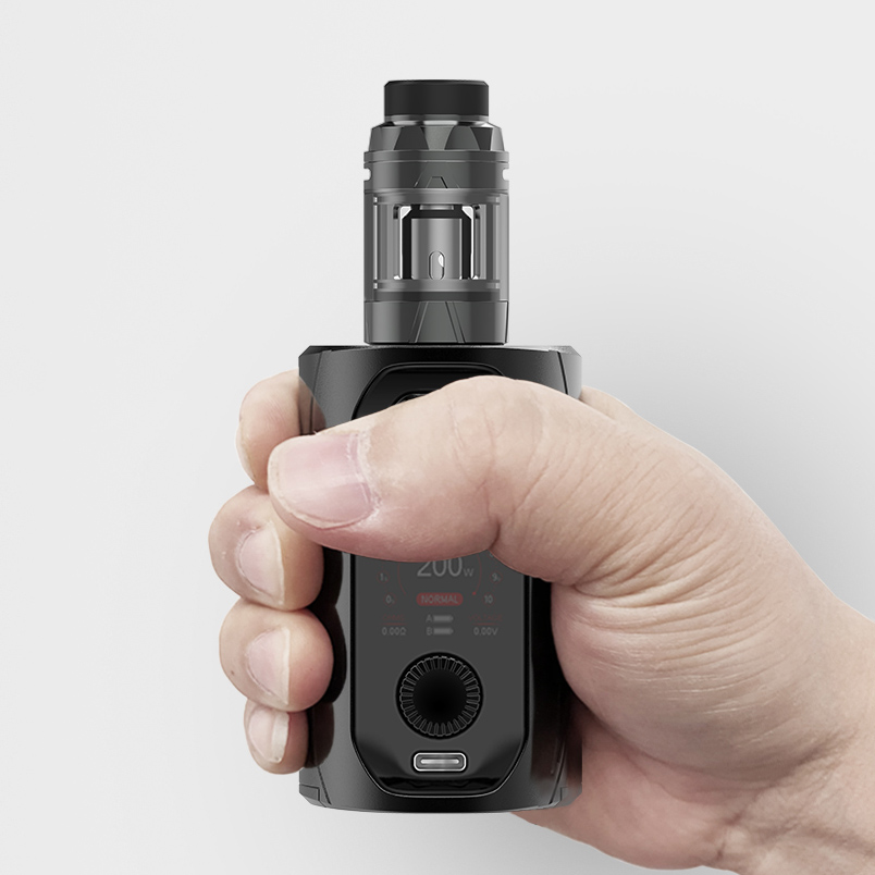 «Всеядный» мод работает с тремя видами аккумуляторов — 21700, 20700 и 18650, для последнего предусматривается адаптер. Зарядка осуществляется через USB Type-C током в 1,2А. Мощность можно регулировать в диапазоне от 5 до 217 ватт при помощи цветного интерфейса в виде спидометра. Помимо того, предусматривается варивольт с максимумом в 12 вольт, bypass и режим температурного контроля.