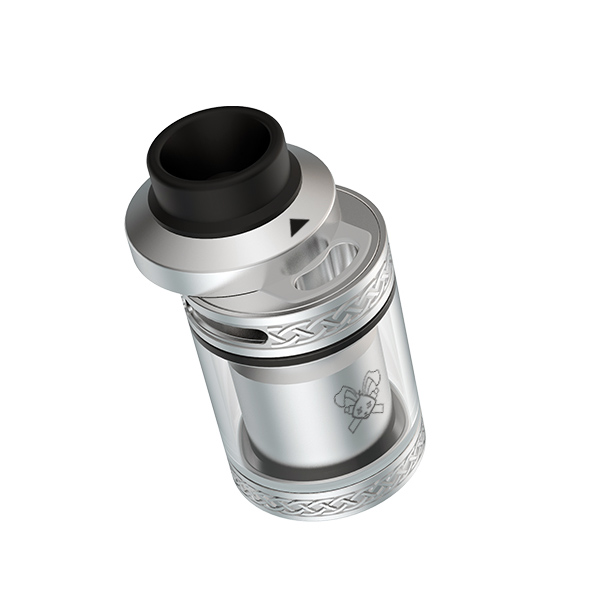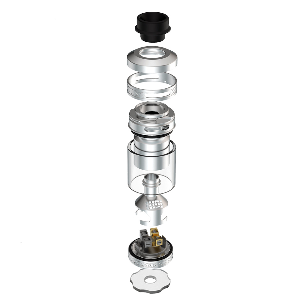 Под дополнительным внутренним куполом скрывается просторная база с парой крупных Y-образных стоек. Ножки двух спиралей устанавливаются в вертикальной плоскости и фиксируются боковыми винтами с прямыми шлицами. По периферии деки располагаются вытянутые прорези с бортами для укладки ваты. Регулировка затяжки осуществляется с помощью герметичного верхнего кольца. Объем бака можно увеличить с 2 до 5 мл благодаря расширенному стеклу.