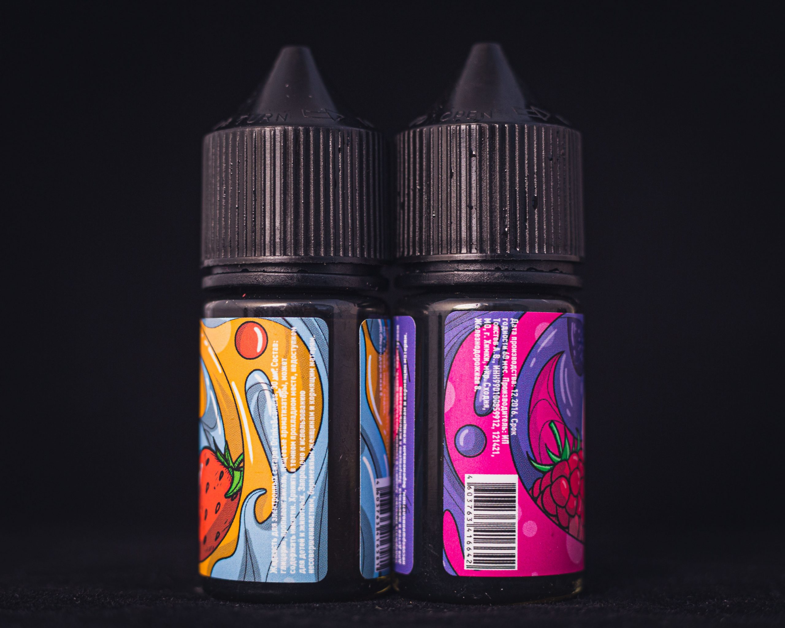 Жидкость поставляется в темных пластиковых флаконах на 30 мл с тонкими прямыми капельницами. На удобной широкой крышке предусматриваются контроль вскрытия и защита от детей. Стиль оформления матовой этикетки зависит от выбранного вкуса — каждой вариации соответсвует определенная цветовая палитра и изображения ингредиентов. На фасаде имеется небольшая пиктограмма, информирующая об уровне никотина. Правая часть этикетки отмечена кратким описанием, составом и предупреждениями. Слева находятся дата и место производства, а также штрихкод.