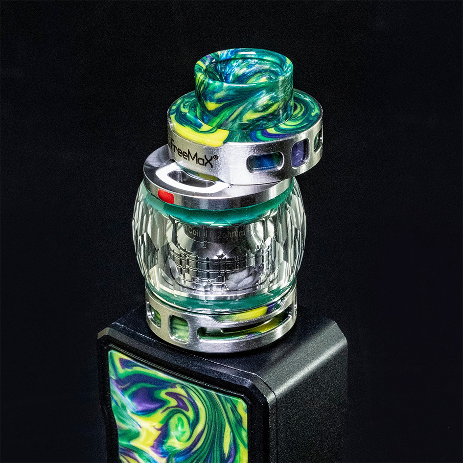Необслуживаемый бак Fireluke, отделан эпоксидкой под стать моду. В резерве предусматривает пара разнообразных сеточных испарителей на 0,2 и 0,15 Ом. Оригинальная граненная колба позволяет уместить 5 мл жидкости. Доступ к заправочному отверстию ограничивается герметичным сдвигающимся топкепом. На основании предусматривается стандартное кольцо обдува.