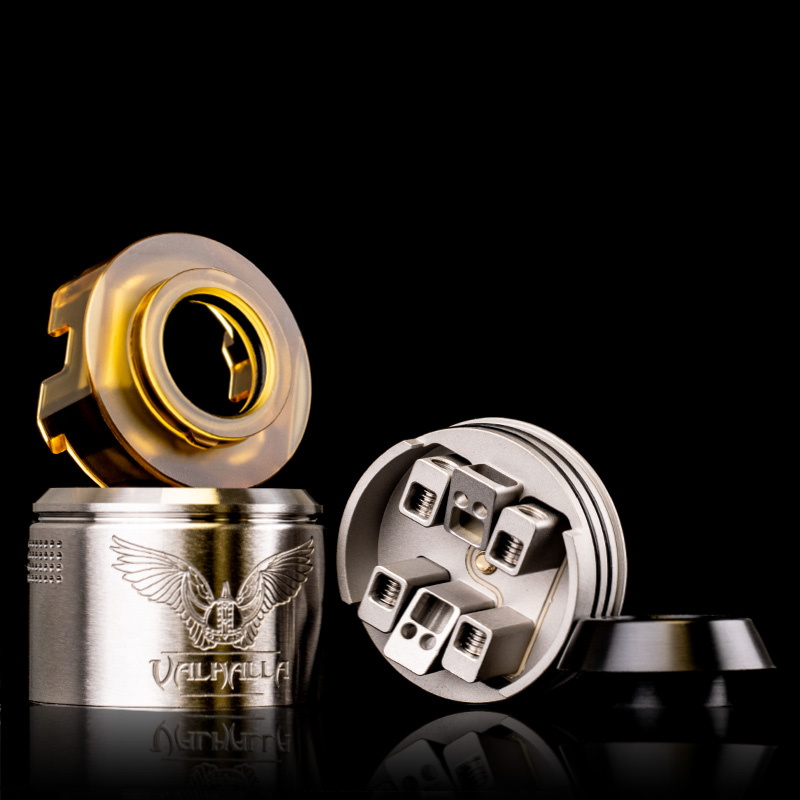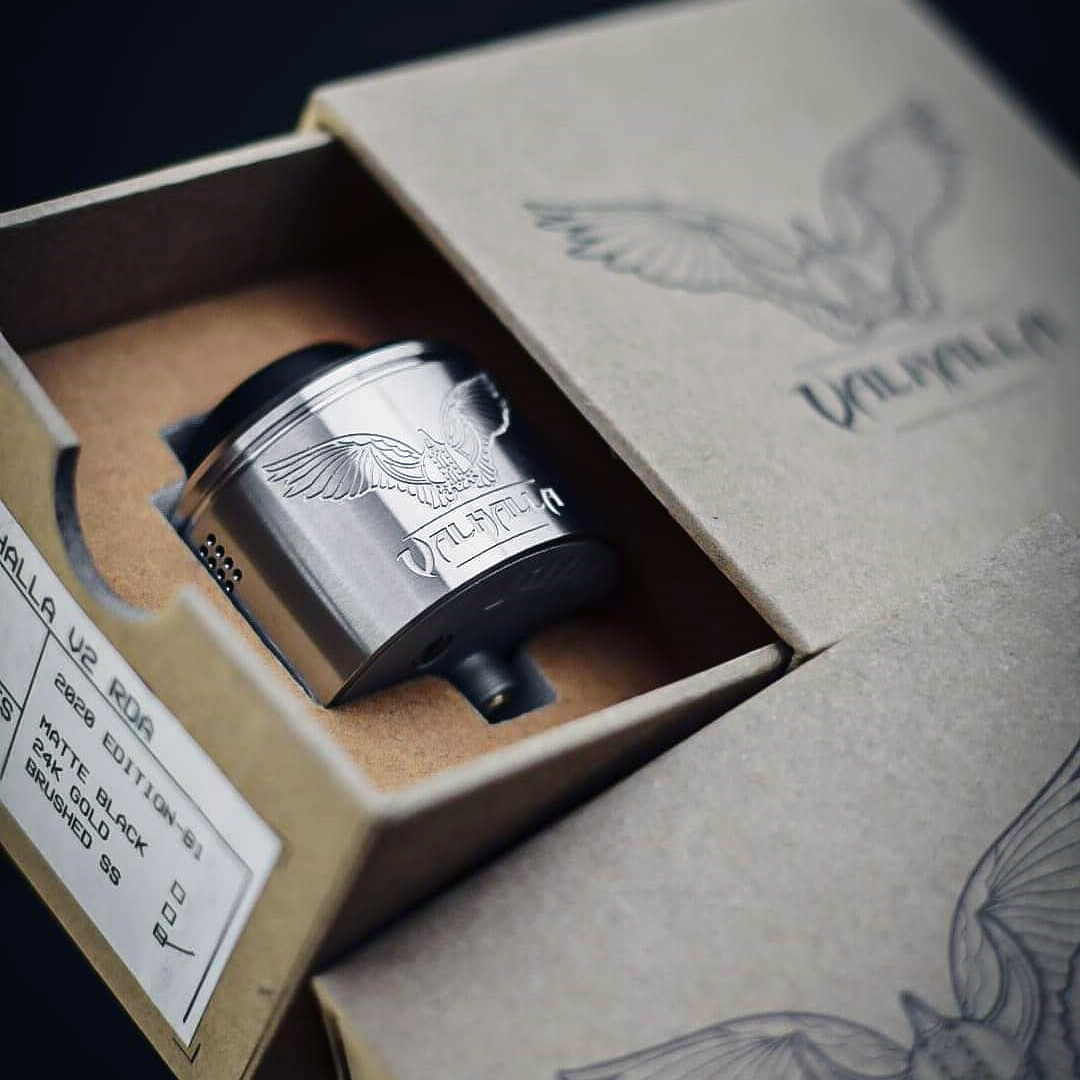 22 июня компания Vaperz Cloud представила в инстаграме массивную двухспиральную дрипку — Valhalla V2 RDA. Основным материалом для экстравагантного девайса выступила высококачественная нержавеющая сталь. Палитра расцветок ограничилась тремя дежурными вариантами — чёрным, серебристым и золотым. Монолитный широкий купол получил диаметр в 40 мм, подчёркнутую верхушку и приземистый дельриновый дриптип в форме усечённого конуса. По бокам вырезали две воздухозаборные группы, каждая состоит из сорока четырех маленьких перфораций. В качестве украшения выгравировали крупный рельефный логототип.