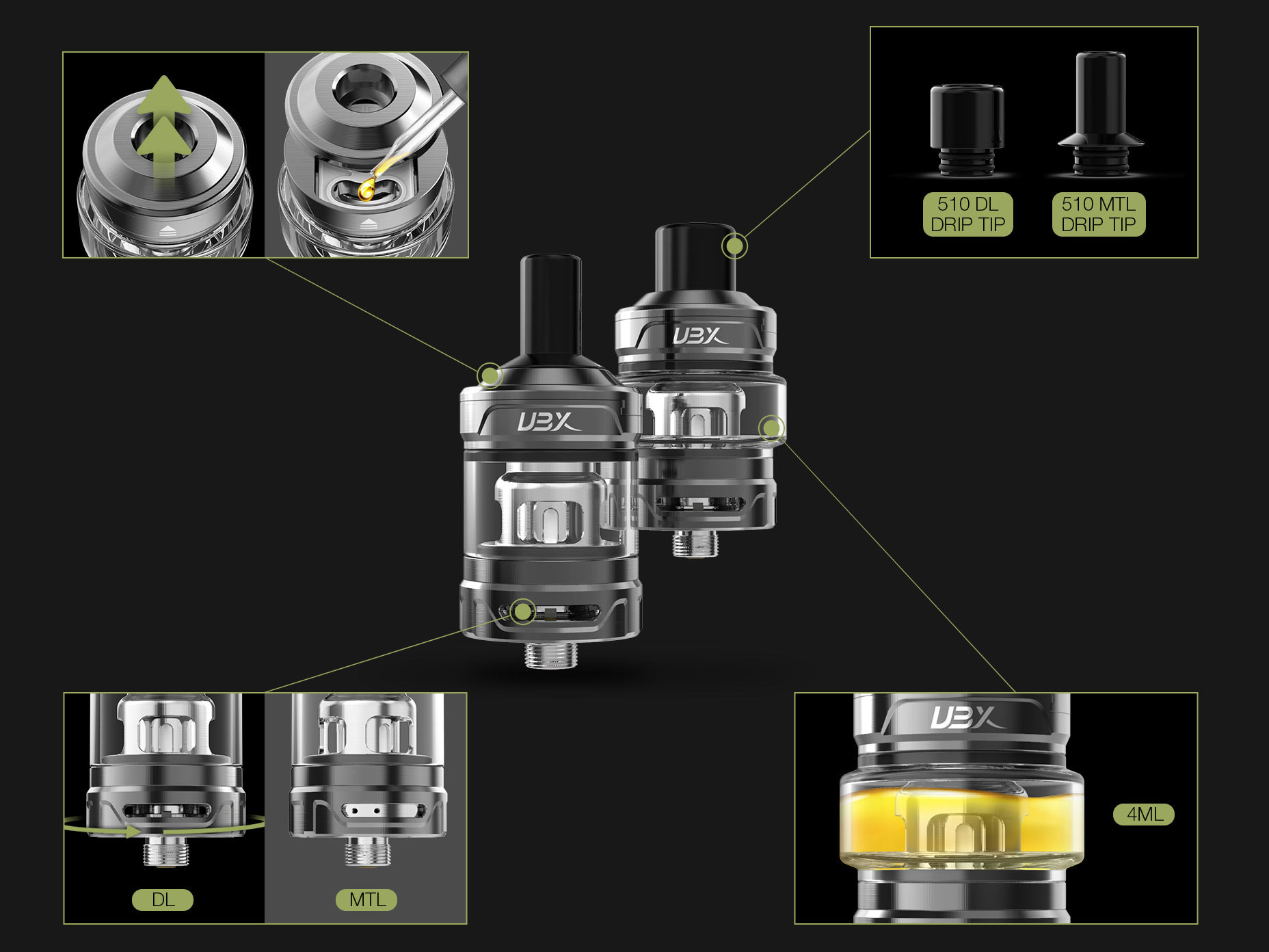 Бак Ultra Boost X Tank поддерживает пять видов сменных испарителей и обслуживаемую базу с двумя стойками под одну спираль. Стандартным комплектом предусматривается два сменных экземпляра для разных стилей парения — на 0,15 и 1,0 Ом. Интенсивность обдува настраивается поворотом нижнего кольца с множество разнокалиберных отверстий. Обычную колбу с объёмом в 2 мл можно заменить расширенной вариацией на 4 мл. Заправочное отверстие скрывается за сдвигающимся топкепом и комплектуется силиконовой вставкой.