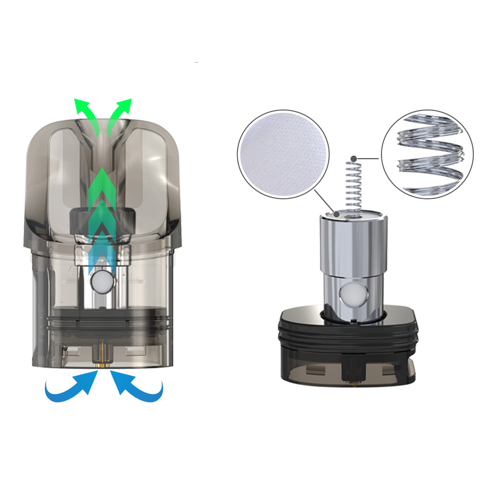 Зажигание осуществляется при затягивании. Максимальная мощность составляет 11 ватт. Работа обеспечивается за счет интегрированной батареи с запасом в 480 мАч. Зарядку следует производить через USB-порт током в 0,5А. Доступное сопротивление находится в диапазоне от 1,0 до 2,0 Ом. Миниатюрное устройство комплектуется одноименными фирменными картриджами на встроенных испарителях с канталовой спиралью на 1,3 Ом и органическим хлопком из водорослей. За фиксацию отвечает магнитный коннектор. Полупрозрачный резервуар обладает стандартным объемом в 2 мл. Заправочное отверстие скрывается на боковой стенке за силиконовой заглушкой.