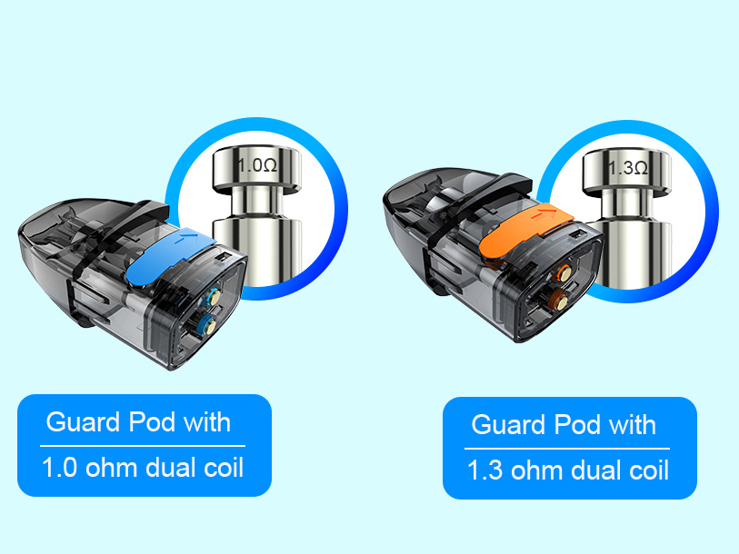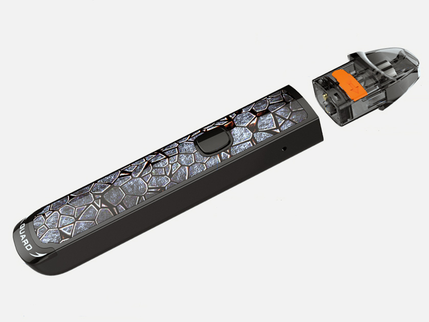 1 августа компания AAA Vape анонсировала в интсгараме all-in-one девайс — Guard Pod Kit. Под-систему упаковали в вытянутою цинковую форму с узким профилем и скругленными концами. В качестве декора, вдоль корпуса растянули контрастные полимерные панели с разнообразными изображениями. В палитру включили не менее семи вариаций. Расцветки отличаются не только текстурами вставок, но и оттенками металлического каркаса. Центр фасада заняла квадратная кнопка зажигания, окольцованная индикатором сопротивления. Ниже разместили micro-USB порт и логотип с трёхцветной подсветкой. По бокам вырезали маленькие воздухозаборные точки. Предусматривается съемное силиконовое кольцо с темляком.