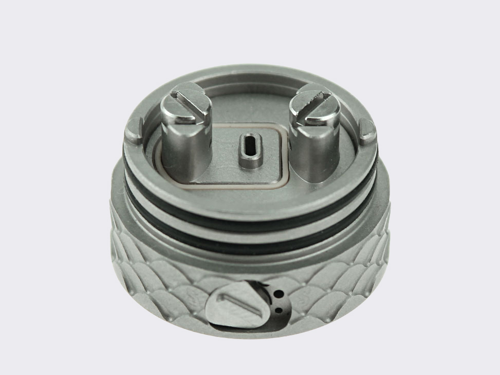 В центре миниатюрной базы возвышаются две овальные стойки для фиксации спирали. Ножки следует разместить в горизонтальной плоскости, на платформах и прижать сверху винтами под прямую отвёртку. Обдув поступает на намотку снизу и по бокам. Воздушные потоки настраиваются раздельно при помощи оригинальных маленьких регуляторов в основании бака. Объём можно увеличить с 2 до 4 мл посредством дополнительной колбы и удлинённой шахты. Заправка осуществляется сверху. Помимо стандартного пина, предусматривается альтернативный вариант для работы со сквонк-модами.