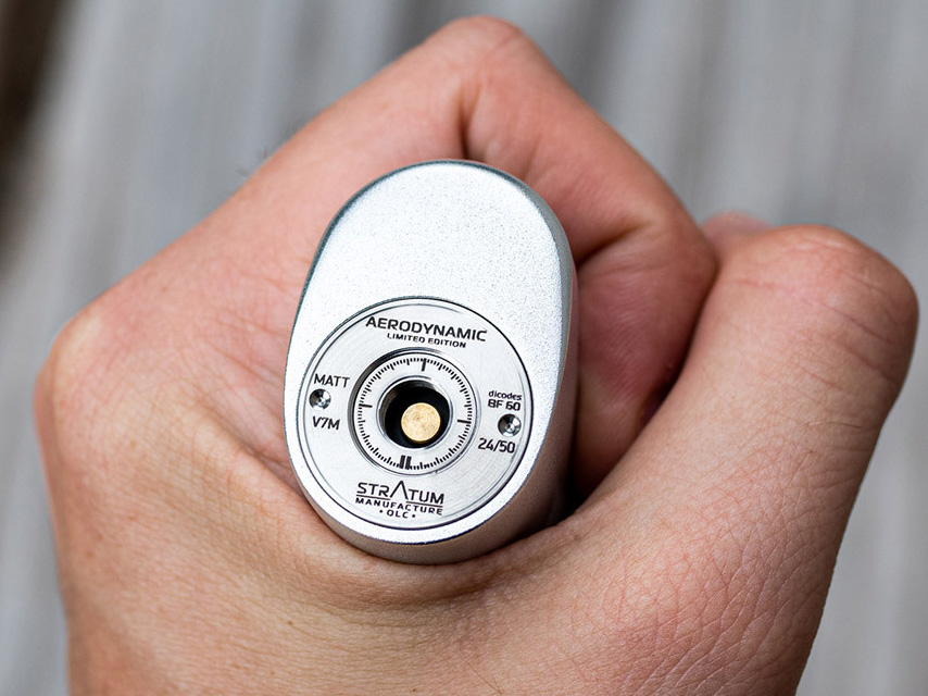 18 августа компания OLC анонсировала на странице в фейсбуке оригинальный однобаночный мод — Stratum V7M Aerodynamic. Девайс реализовали в лаконичном, но весьма нетривиальном стиле в двух сдержанных расцветках. Плавный корпус обеспечили эргономичной формой без резких граней и острых углов, а также наделили лёгким весом благодаря алюминиевому сплаву в качестве основного материала. Тыльную сторону украсили крупным вырезом, обнажающим стальной аккумуляторный цилиндр. Кнопку fire интегрировали в дисплей и разместили на узком округлом фасаде. На дне разместили пару клавиш управления и скручивающуюся площадку с ключом. Посадочную площадку дополнили фирменной гравировкой и ограничили диаметром в 24 мм.