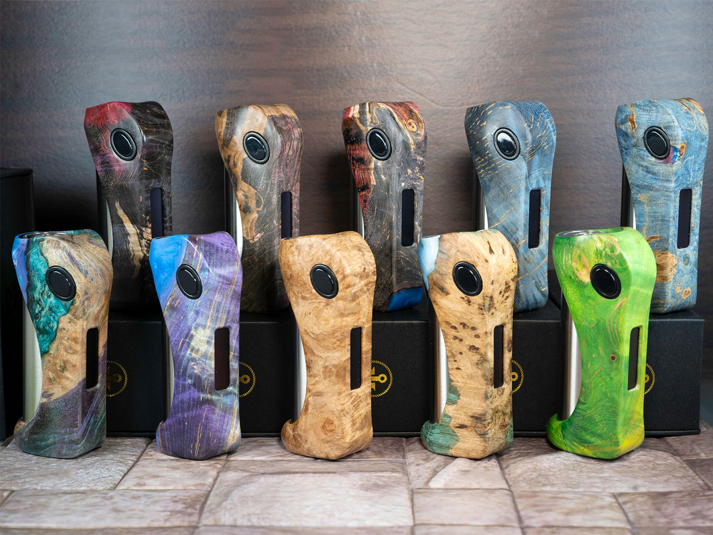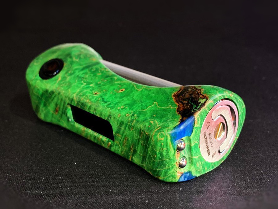 2 сентября компания Ultroner представила в инстаграме нетривиальный боксмод — Alieno Box Mod. Девайс обеспечили удобной анатомической формой, напоминающей голову инопланетянина из-за пары овальных клавиш зажигания, расположенных по бокам. Каркас выполнили из разноцветной стабилизированной древесины в десяти расцветках. В центре узкой лицевой стороны установили небольшой дисплей. На обороте сделали крупный вырез, обнажающий съемный аккумуляторный цилиндр. Дно укомплектовали парой регулировочных кнопок и скручивающейся крышкой с откидным ключом. Стальную посадочную площадку дополнили альтернативным коннектором, позволяющим увеличить диаметр с 22 до 24 мм.