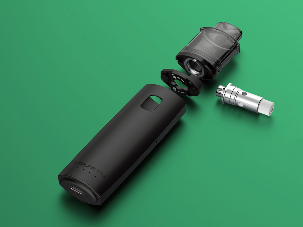 1 октября в ряде интернет-магазинов появился стартовый набор — Endura M18 Pod Kit. Под-систему упаковали в лаконичный лёгкий корпус с выпуклым профилем и миниатюрными габаритами, не превышающими в высоту 87 мм. В гамму расцветок включили шесть монотонных вариаций. На минималистичном фасаде разместили комплект маленьких индикаторов, скромный логотип, а также вырезали прямоугольное окно для контроля жидкости. Противоположную сторону перфорировали аналогичным отверстием. Съёмный картридж полностью спрятали за стенками мода, оставив сверху лишь широкий приплюснутый мундштук. Основание одного из узких торцов дополнили небольшой кнопкой. USB-порт отправили на дно.