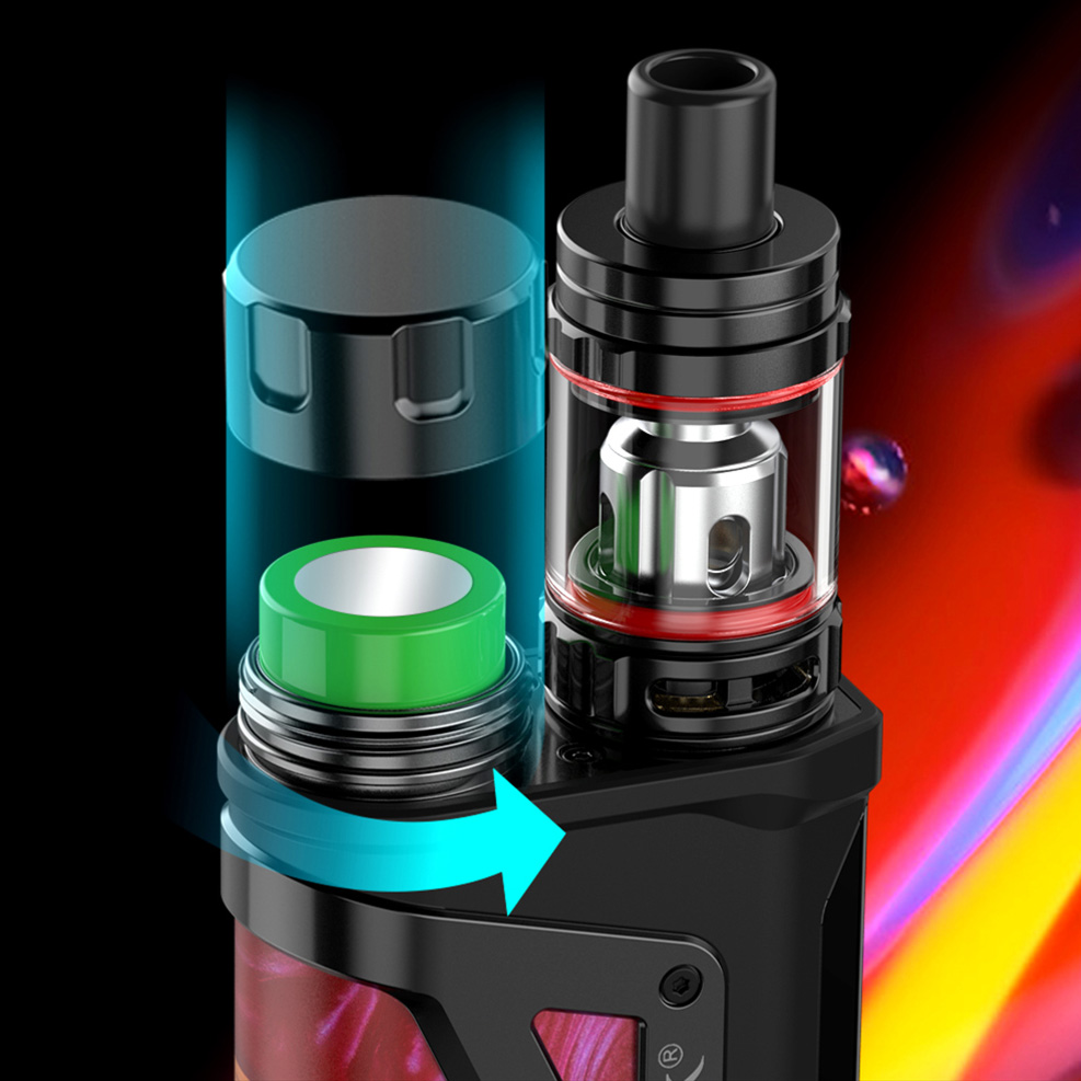 Комплектный бак TFV9 Mini отличается обновлённой конструкцией с небольшими габаритами и удобным сдвигающимся топкепом. Внутри находится предварительно установленный испаритель V9 с сеткой на 0,15 Ом. В запасе предусматривается аналогичный резервный экземпляр. Обдув можно отрегулировать при помощи нижнего кольца. Объём колбы составит 2 либо 3 мл в зависимости от версии.
