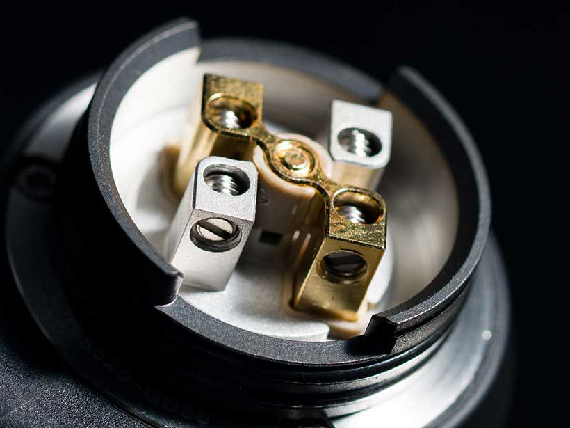 Центр просторной базы занимает угловатая конструкция, обеспечивающая фиксацию одной либо двух спиралей. Ножки намотки следует вертикально расположить в круглых слотах на верхних площадках и зажать боковыми винтами со шлицами под прямую отвёртку. Купол неподвижно фиксируется на бортах базы при помощи длинных выемок и пары орингов. Высокие стенки и вместительная минималистичная дека образуют ёмкую ванночку для жидкости. Обдув можно реализовать как в свободном, так и в сигаретном стиле благодаря вращающейся крышке и множеству узких воздушных перфораций. Помимо стандартного пина, предусматривается вариант для работы со сквонкерами.