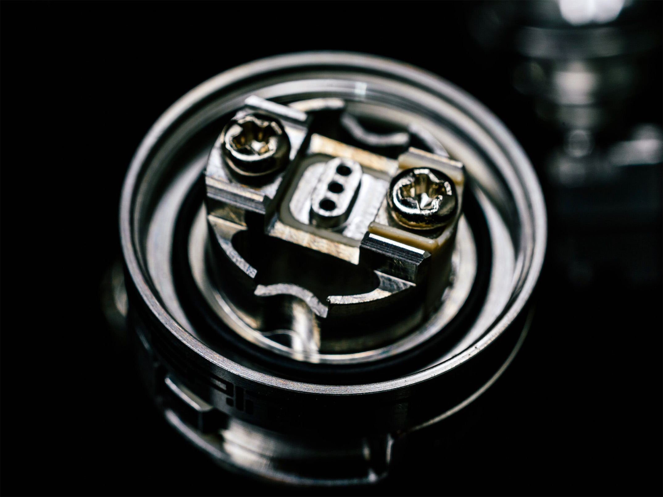 Под куполом скрывается компактная дека с двумя коренастыми стойками, между которыми будет фиксировать одна спираль. Ножки намотки следует горизонтально разместить на широких платформах с ограничителями и прижать сверху винтами по крестовую отвёртку. Объём испарительной камеры можно уменьшить посредством альтернативной крышки с шахтой. Воздушный поток подаётся на намотку снизу. За регулировку обдува отвечают кольцо с пять разнокалиберными перфорациями и две сменные вставки. Колба обладает слегка увеличенным объёмом в 2,5 мл.