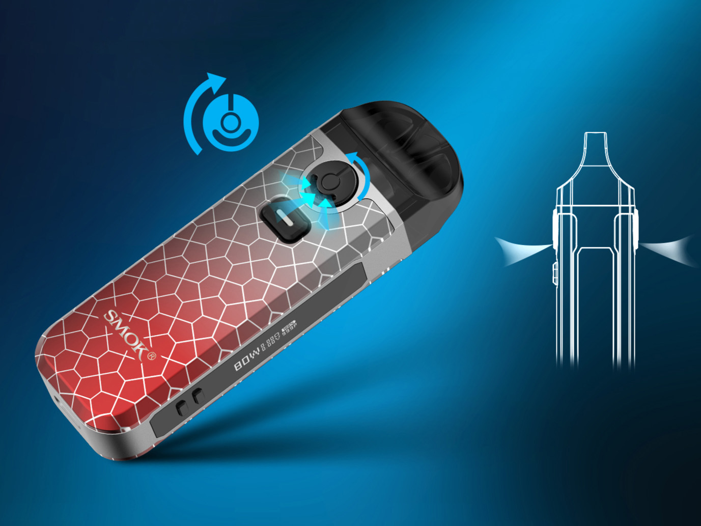 Не смотря на свои скромные габариты, под-система может похвастаться солидным диапазоном мощности от 1 до 80 ватт. Сопротивление может варьироваться в пределах от 0,15 до 2,5 Ом. За питание отвечает вместительная батарея с запасом в 2000 мАч. Зарядка осуществляется через USB Type-C током в 1,4А. Картридж реализуется в двух схожих вариантах под разные серии испарителей. Стандартным комплектом предусматриваются два сменных сеточных экземпляра с сопротивлением в 0,4 и 0,16 Ом. Бак может уместить 4,5 мл жидкости. Заправочное отверстие находится на торце резервуара. Затяжку можно настроить при помощи круглого регулятора на фасаде.