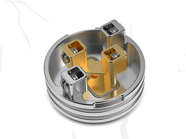 На широкой деке располагаются четыре стойки с небольшим смещением относительно друг друга. Ножки намотки надлежит вертикально разместить в прямоугольных слотах и зажать по бокам винтами под прямую отвёртку. Благодаря просторной базе и крупному зазору между парами стоек можно устанавливать довольно массивные спирали. В центре предусматривается распределительный канал для сбалансированной подачи жидкости через сквонк-пин. Глубина резервуара составляет 5 мм. Затяжка детально настраивается поворотом крышки относительно неподвижной юбки.