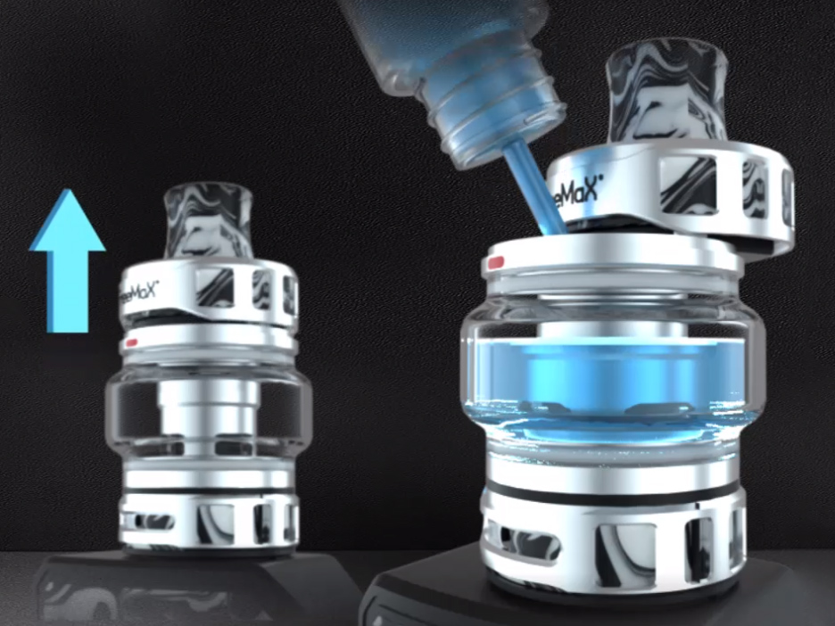 Комплектный бак уже успел зарекомендовать себя в предыдущих наборах компании. Его корпус изготавливается из нержавеющей стали с вкраплениями контрастной эпоксидки, окрашенной на манер мода. На необслуживаемой базе располагается предустановленный испаритель на 0,25 Ом. В запасе имеется дополнительный вариант на сетке с сопротивлением в 0,5 Ом. Объём можно увеличить с 2 до 3,5 мл посредством расширенной колбы. Заправка осуществляется сверху. На основании находится кольцо для настройки обдува.