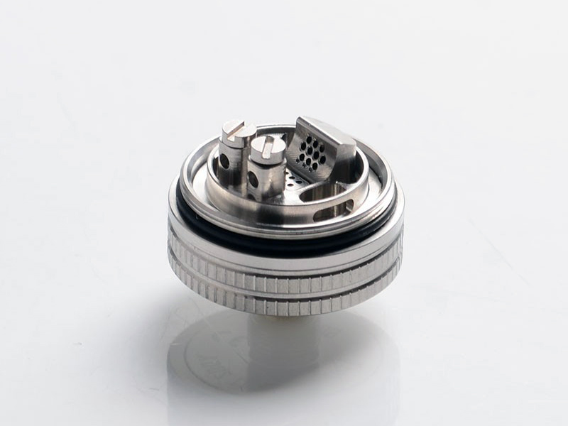 Один из краёв компактной базы занимает пара цилиндрических стоек с крупными винтами под прямую отвёртку. На противоположной стороне располагается изогнутая перфорированная стенка, отвечающая за боковой обдув спирали. Помимо того, воздух подаётся и снизу, через небольшую сменную решётку, реализованную в шести разнообразных вариациях. Ножки спирали следует горизонтально разместить в узких круглых прорезях и зафиксировать верхними винтами. По бокам находятся две ёмкие ванночки для укладки хлопка. Объём можно увеличить с 2 до 4 мл при помощи дополнительной колбы и втулки для шахты.