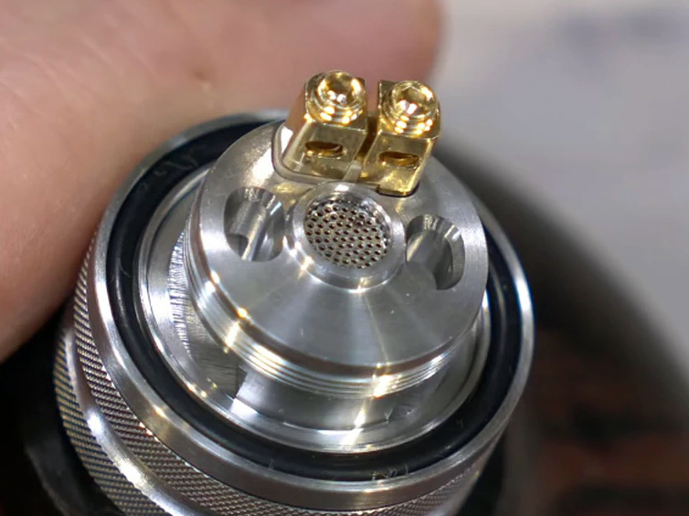 На краю компактной аскетичной базы находится пара позолоченных прямоугольных стоек для установки одной спирали. Ножки будут горизонтально располагаться в узких слотах и фиксироваться верхними винтами под шестигранный ключ. Концы хлопка надлежит укладывать в крупные овальные отверстия, располагающиеся по периферии. Воздушный поток подаётся на намотку снизу, через круглую решётку с множеством мелких перфораций. Для детальной регулировки обдува предусматривается вращающееся кольцо с разнообразными воздухозаборными формациями. Резервуар вмещает 2 мл, возможность увеличения отсутствует.